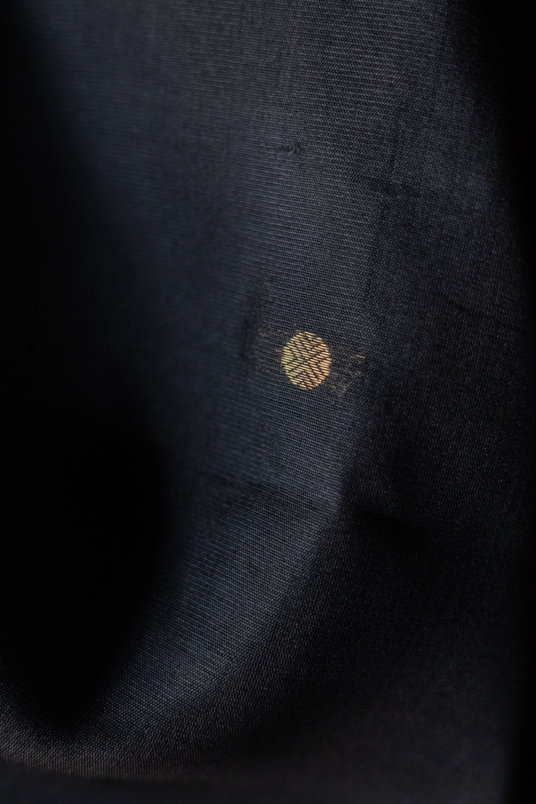 This Black Silk Saree is woven from pure silk, featuring delicate Rudraksham motifs in fine gold zari across the body. The pallu is highlighted by two large mango motifs placed elegantly along its edge, intricately woven in zari to enhance its traditional appeal. The rich silk weave lends a natural sheen and smooth drape, creating a graceful fusion of classic craftsmanship and refined style—beautiful in its simplicity without the addition of a border.