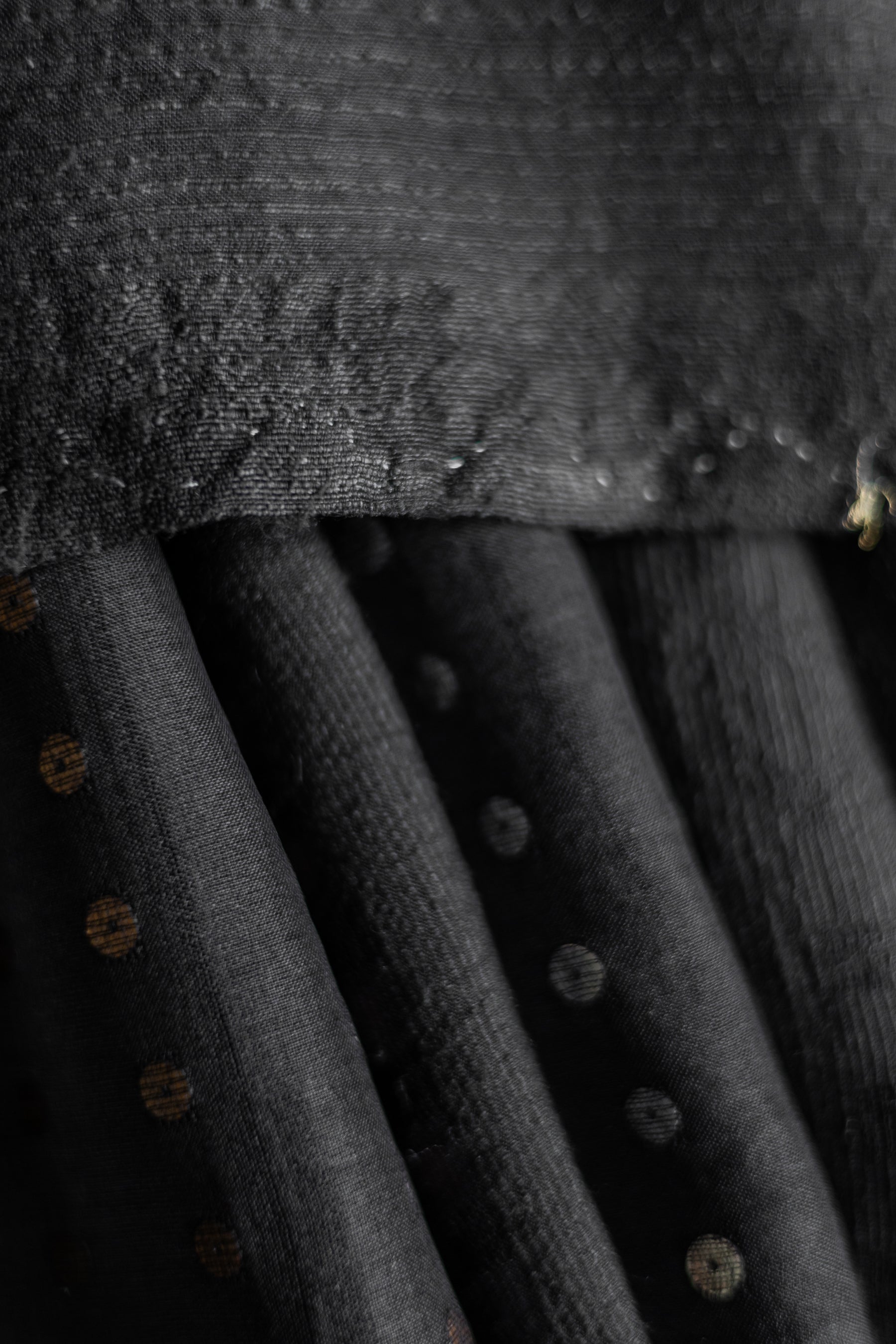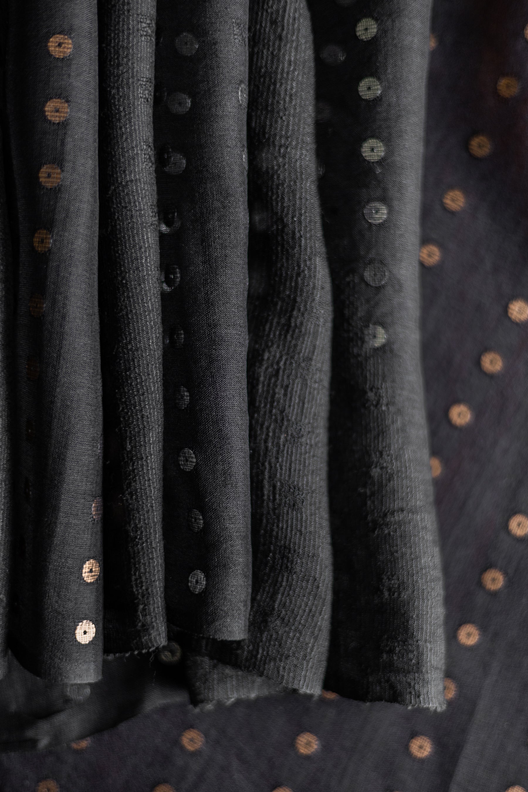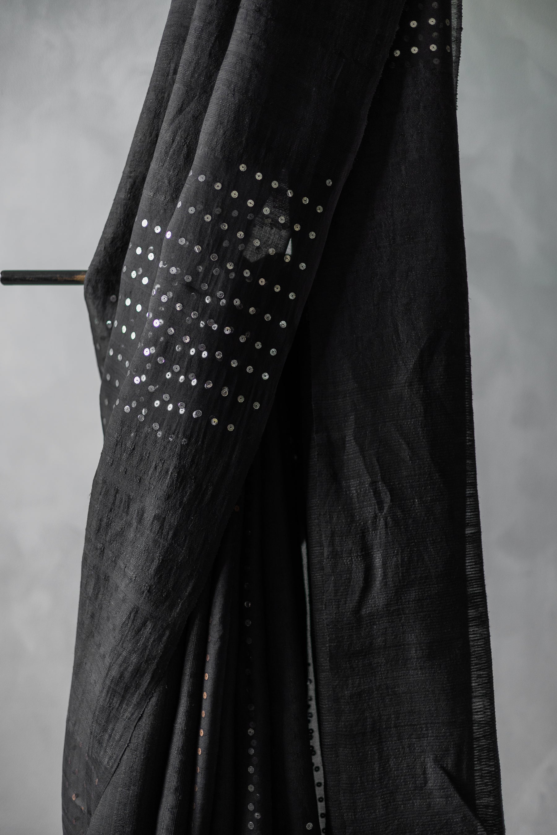 This exquisite saree is crafted from a lightweight blend of silk and tussar organza, offering a delicate yet structured drape with subtle translucence. The base fabric is a deep black, enhanced with intricate gold and silver sequin work that adds shimmering highlights throughout the body. The sequins are meticulously embroidered to create a balanced, elegant pattern that catches light beautifully. Ideal for festive and formal occasions, this saree combines traditional craftsmanship with contemporary design aesthetics.