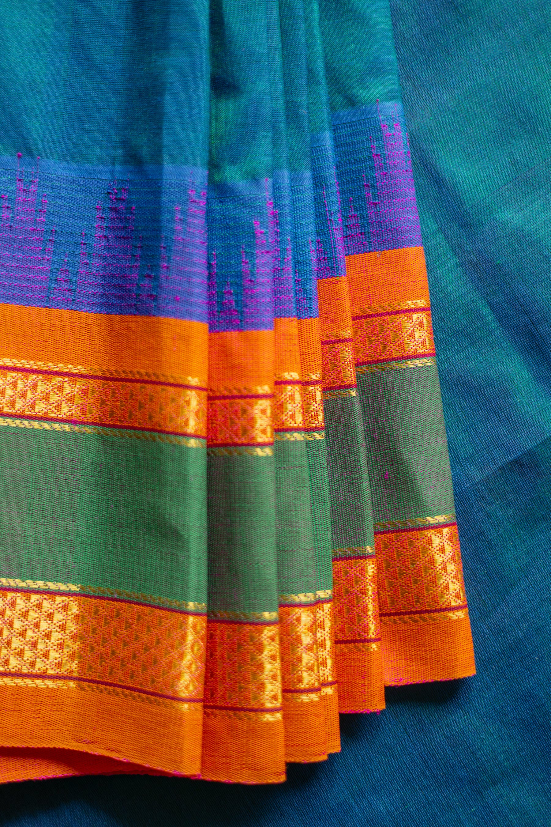 A vibrant blue silk cotton saree featuring a bold and eye-catching broad border in bright orange and green. The body is woven with a fine silk-cotton blend, giving it a soft texture and subtle sheen, making it breathable yet elegant. The contrast border adds a dynamic frame to the saree, while the pallu echoes the vibrant tones for a cohesive finish. Lightweight and easy to drape, this saree is perfect for festive gatherings and daytime occasions.
