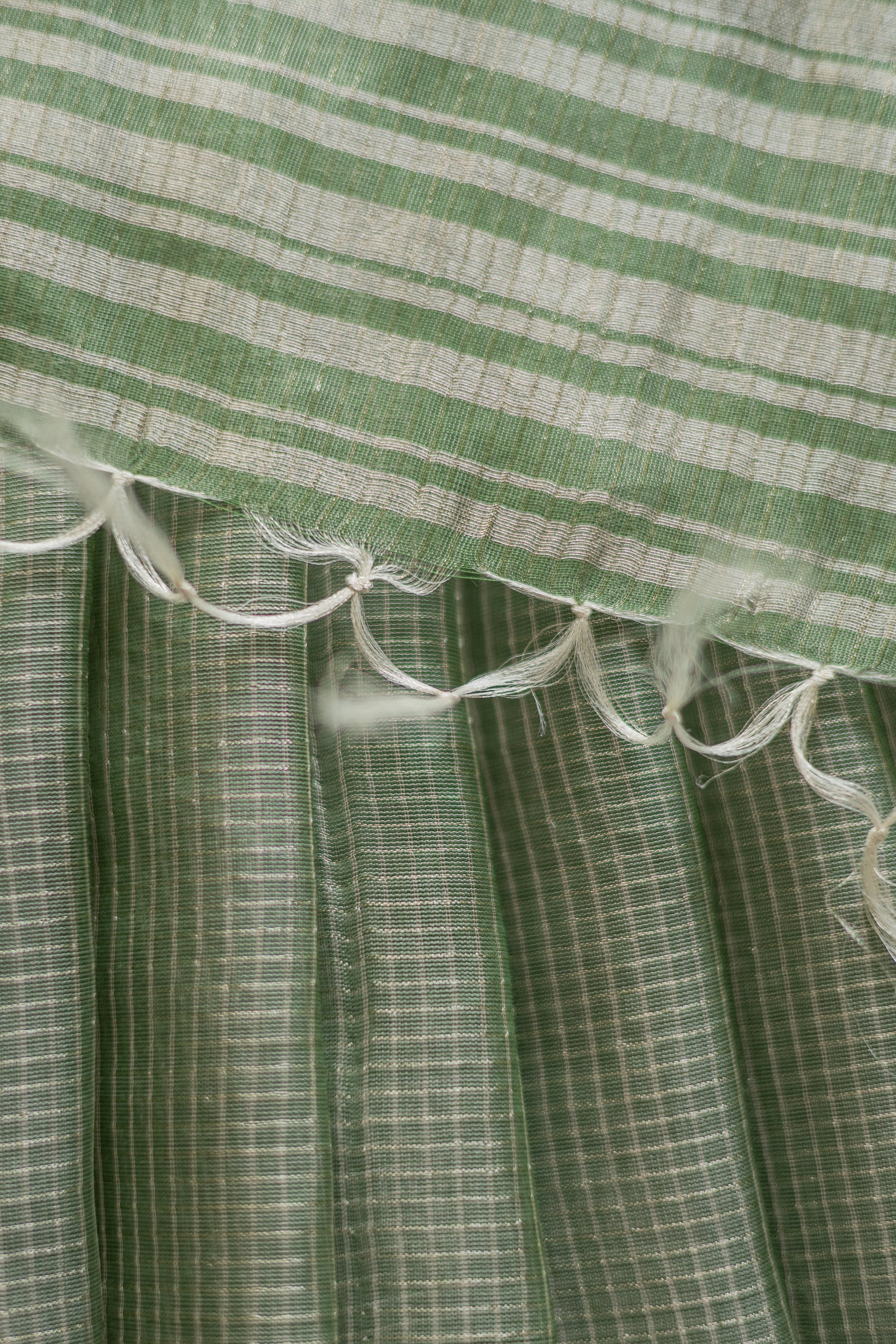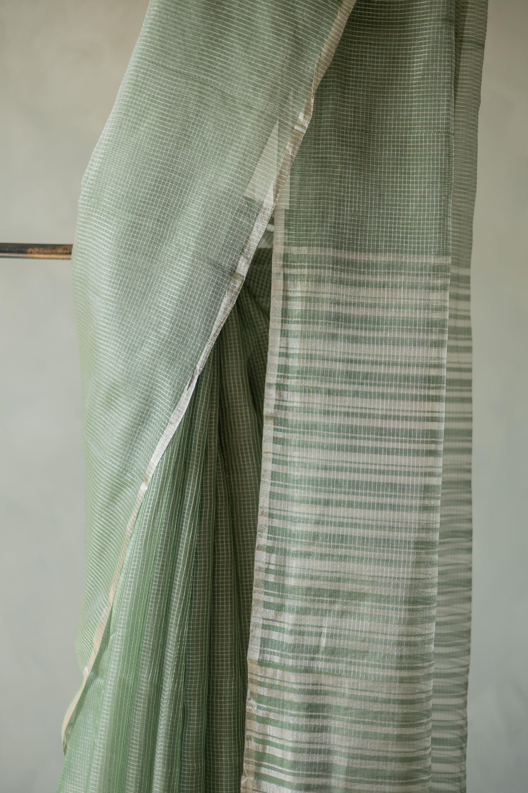 Green Silk Cotton with All Over Silver Small Checks and Striped Pallu Saree