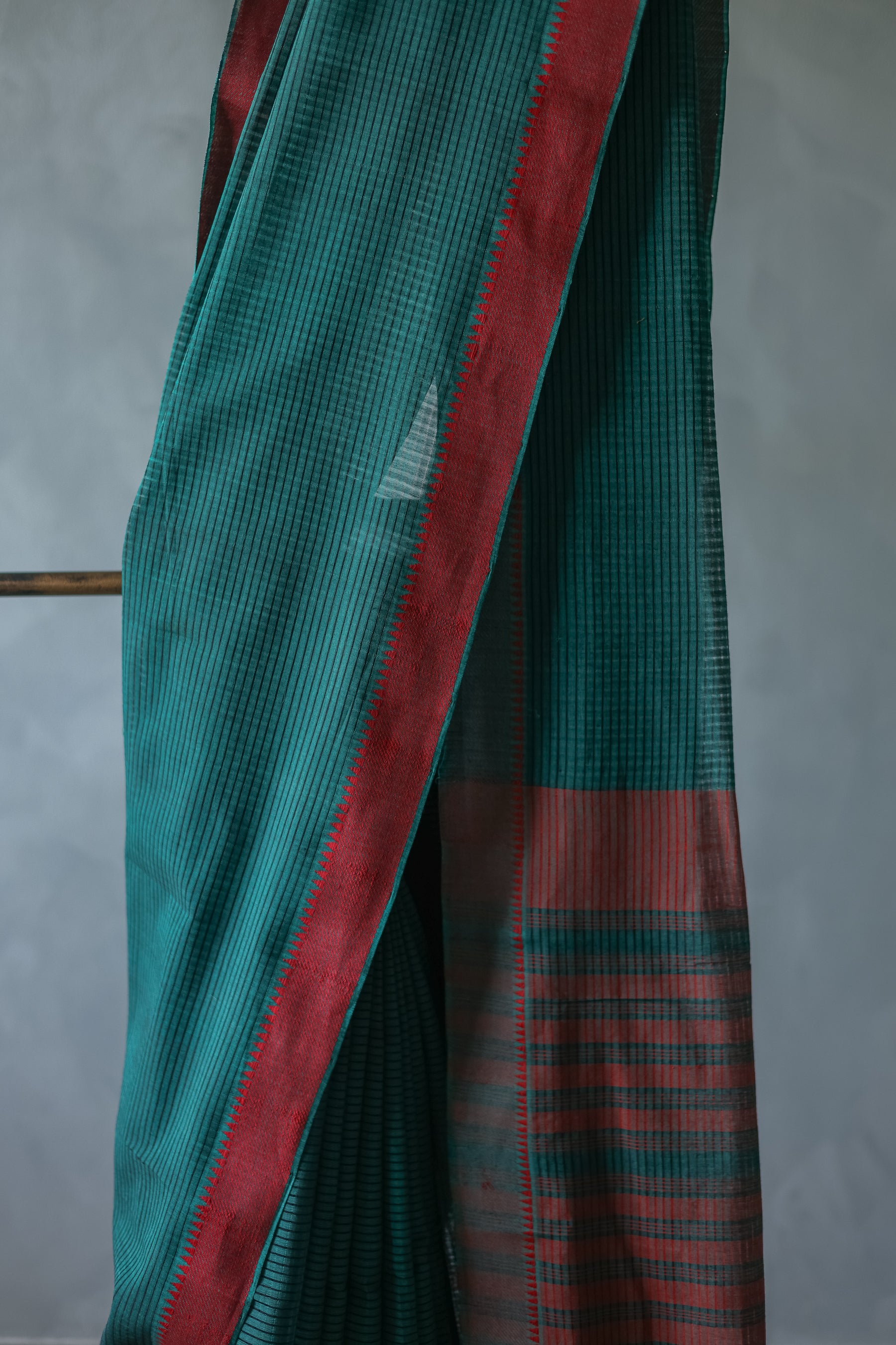 Green with Red Border Striped Pallu Mangalagiri Cotton Saree