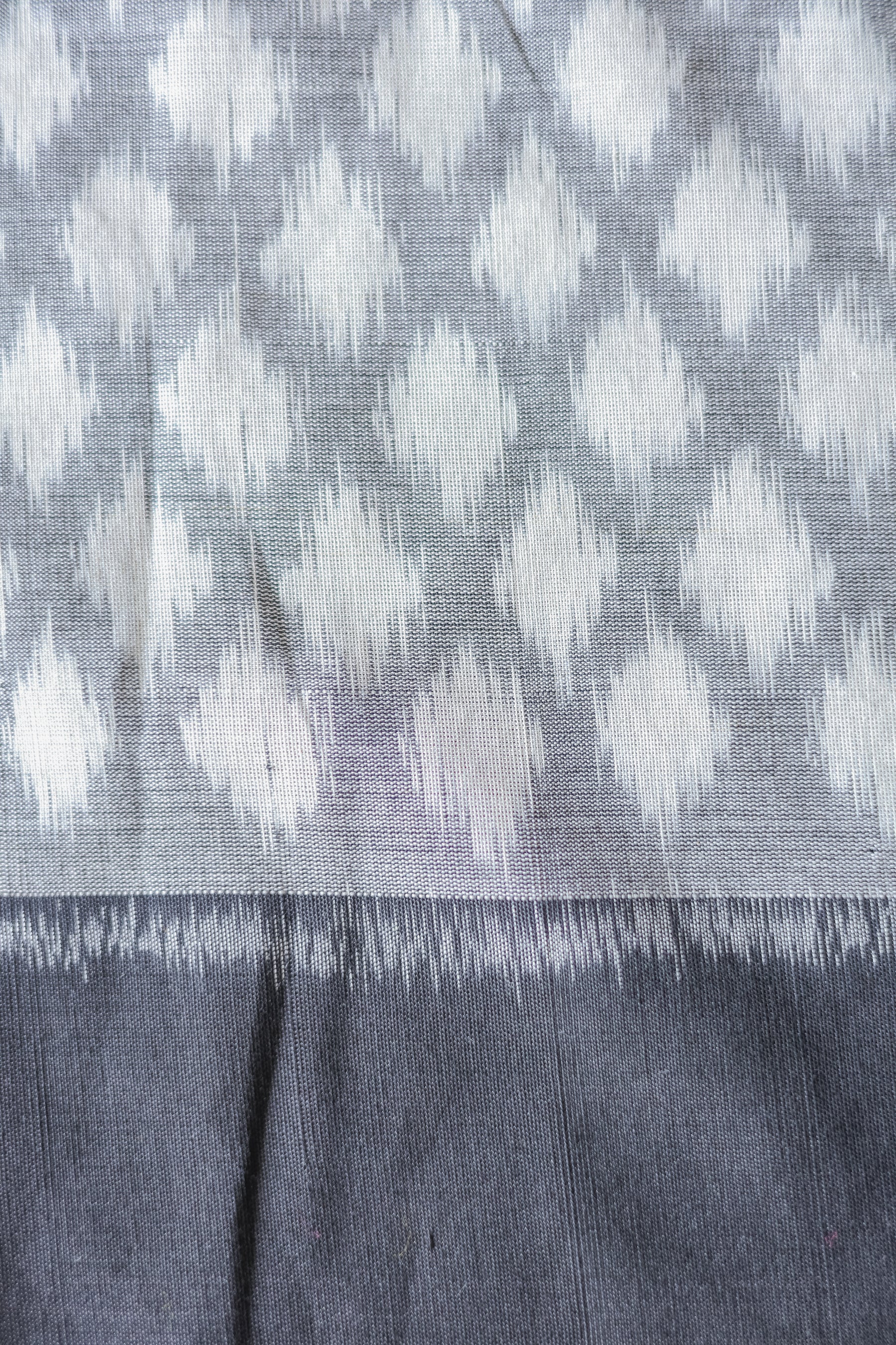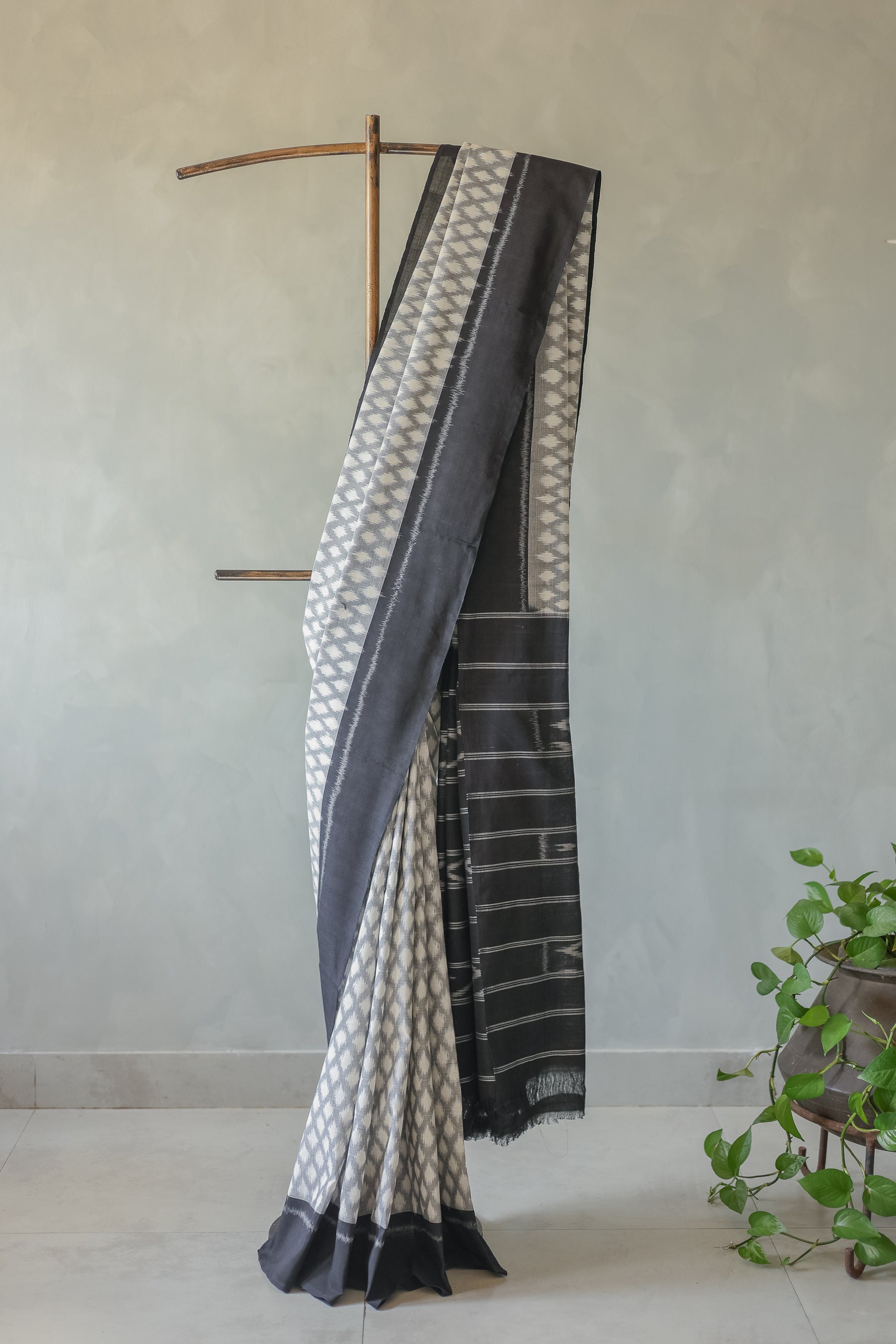 A refined grey and white ikat cotton saree featuring intricate handwoven patterns that blend the two tones in a striking yet subtle design. The bold black border adds contrast and definition, enhancing the visual appeal while maintaining the traditional charm of ikat. Crafted from soft, breathable cotton, the saree offers a lightweight and comfortable drape, perfect for everyday elegance or relaxed festive wear. The pallu extends the black border, tying the look together with understated sophistication.