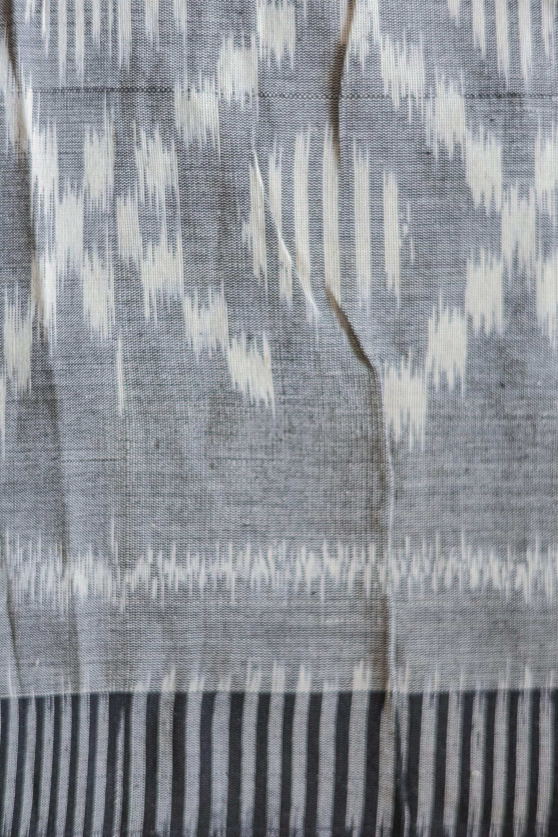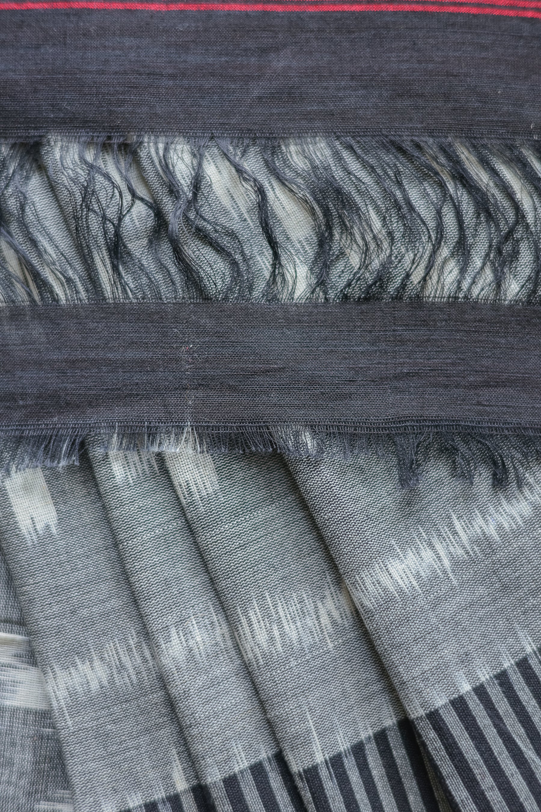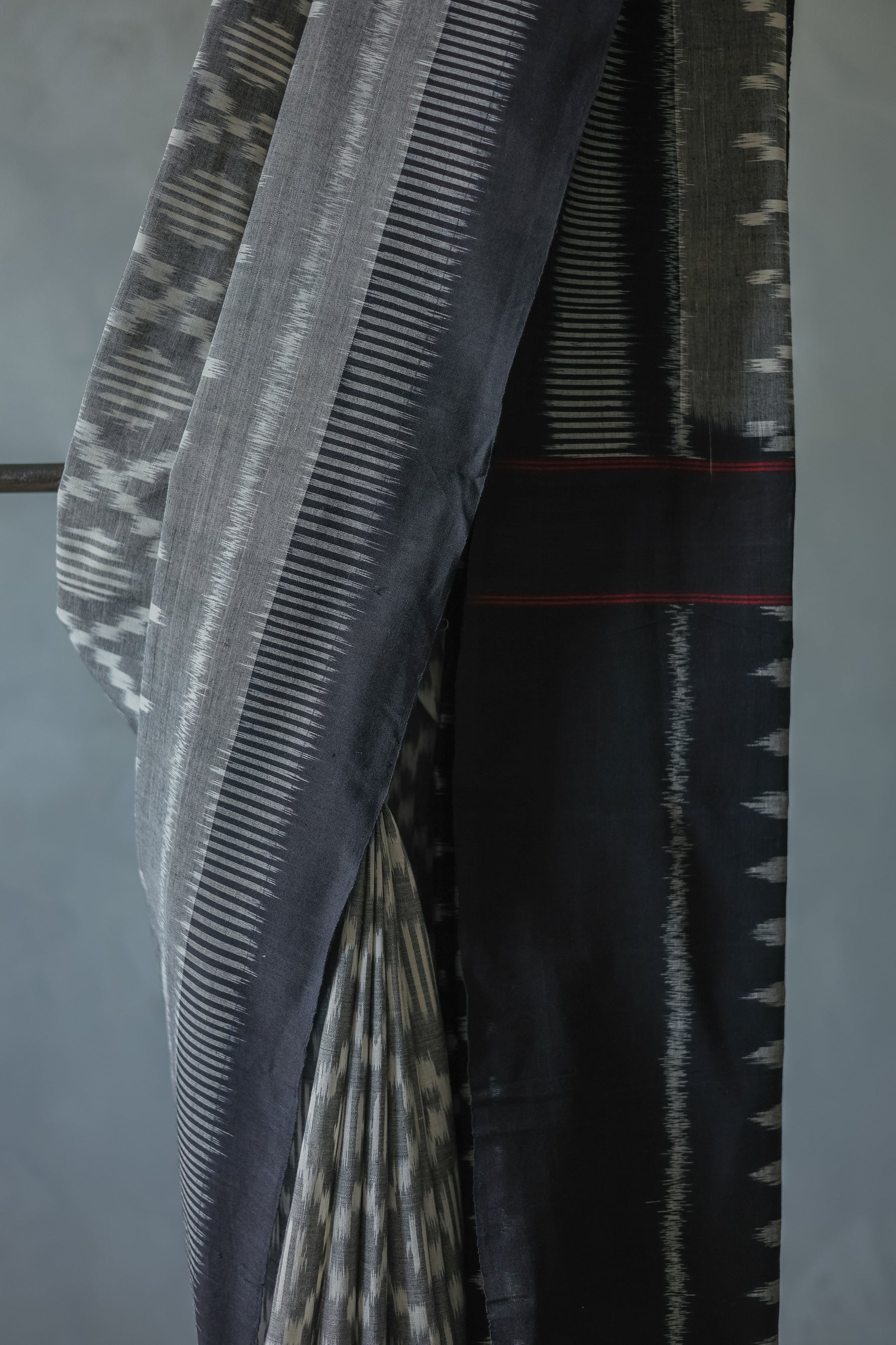 A sophisticated grey ikat cotton saree featuring traditional handwoven patterns that bring depth and texture to the body. The black border provides a bold contrast, adding structure and a contemporary edge to the classic ikat weave. Crafted from breathable cotton, the saree drapes comfortably and is ideal for everyday wear or understated ethnic occasions. The pallu carries forward the black detailing, completing the look with subtle elegance and balance.
