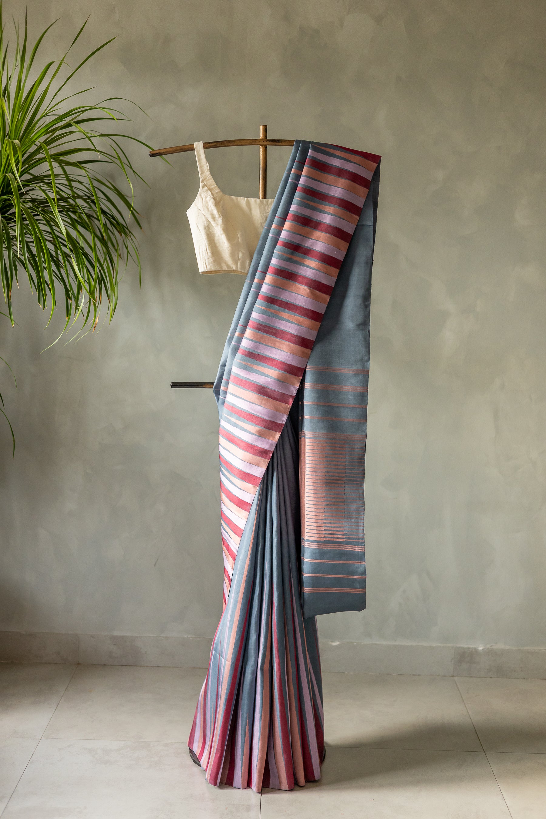 Grey Kanjivaram Silk with Multicolour Geometric Border and Peach Striped Pallu Saree