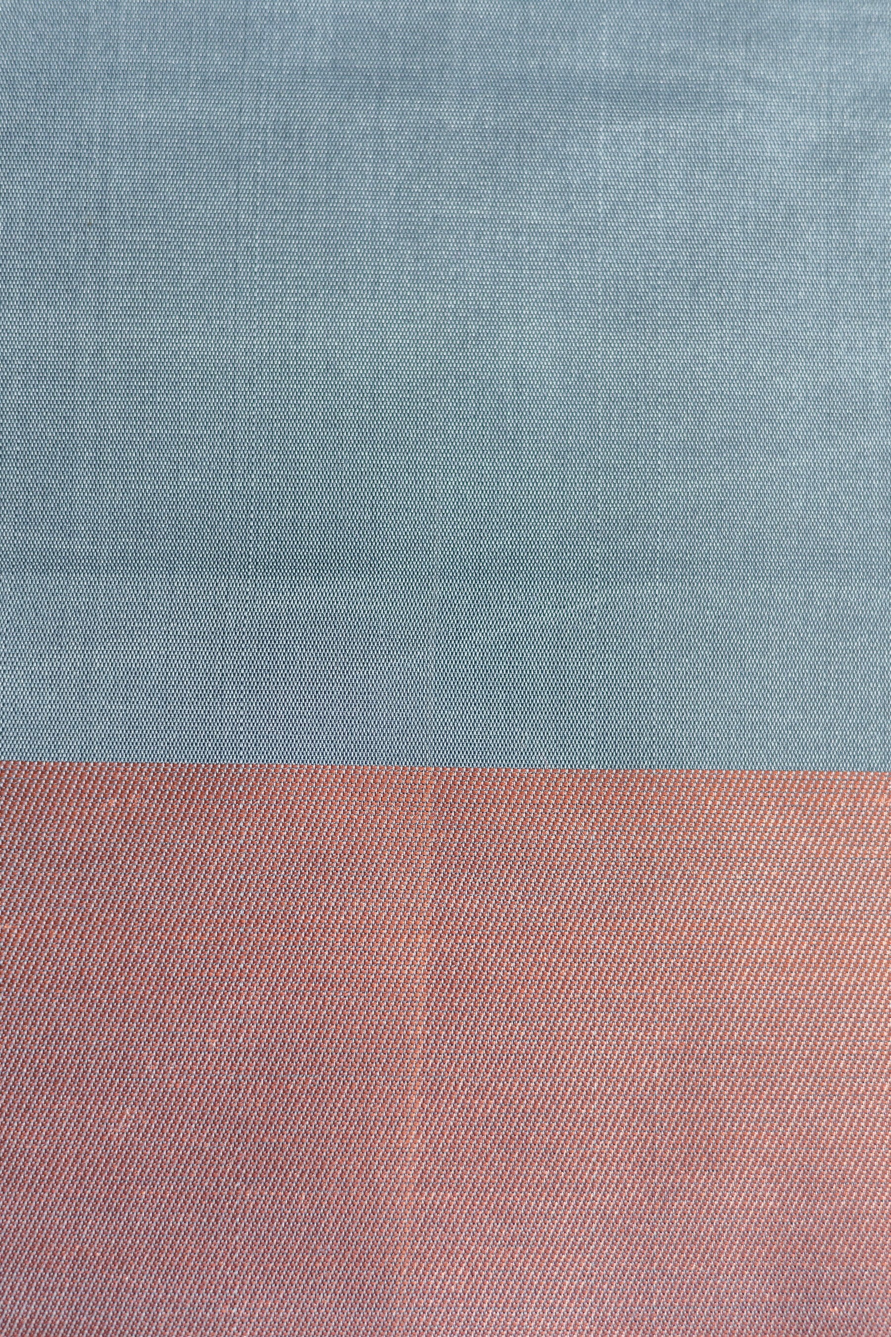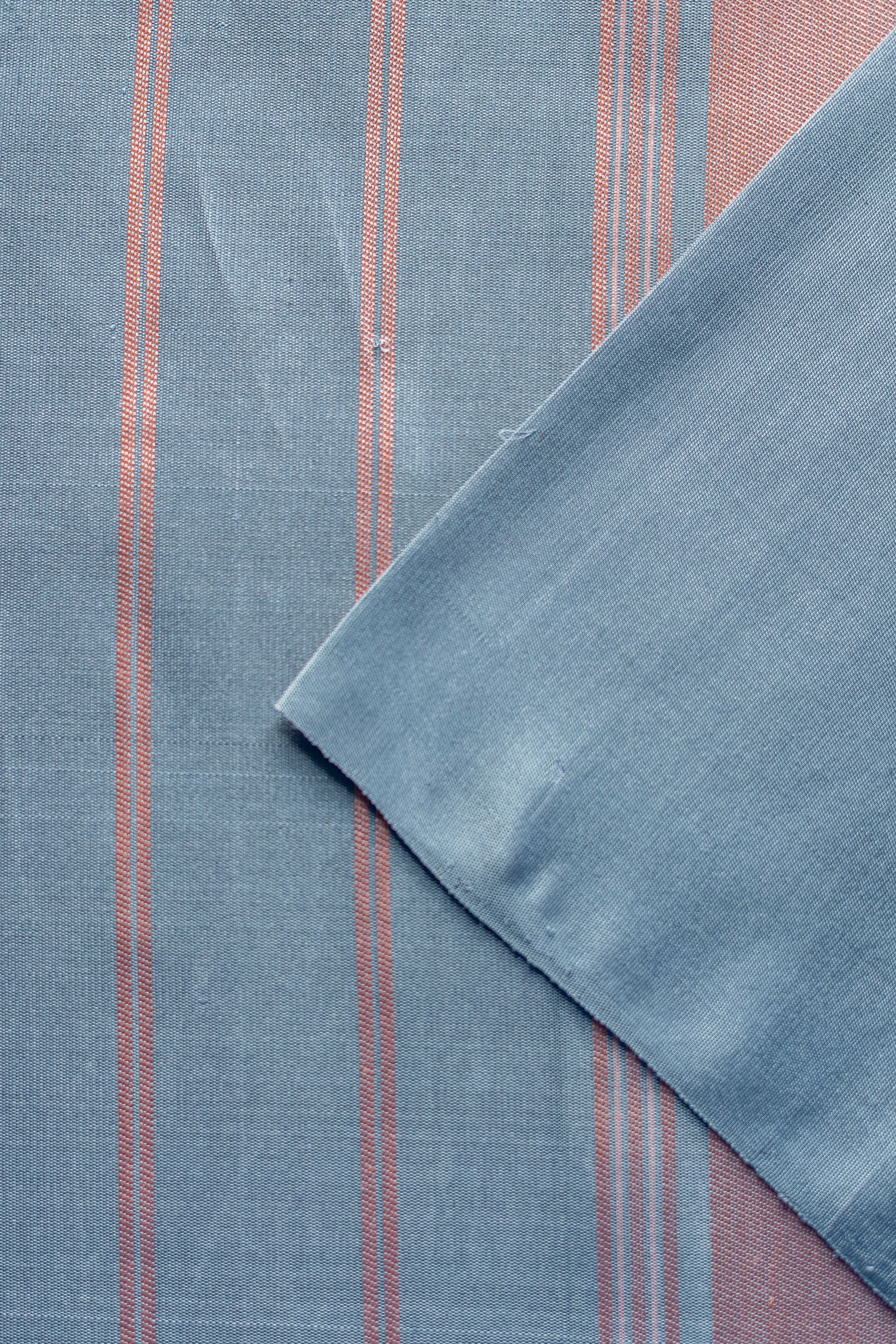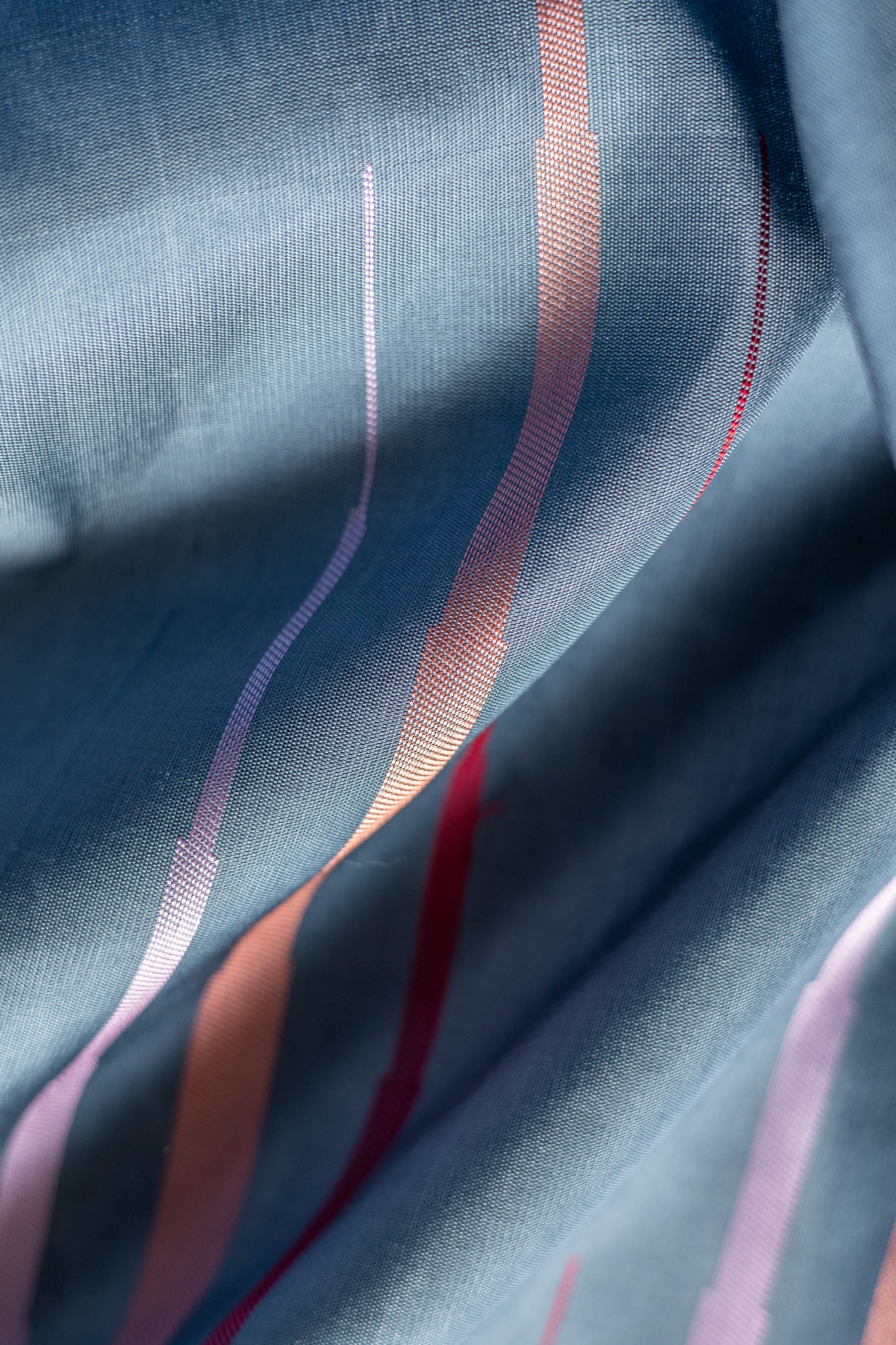 Grey Kanjivaram silk saree crafted from pure mulberry silk with a rich, lustrous body. It features a multicolour geometric woven border created using traditional zari and contrast silk yarns. The peach striped pallu is intricately woven, adding depth and visual balance to the design. Finished with fine silk tassels, showcasing classic Kanchipuram craftsmanship and durability.