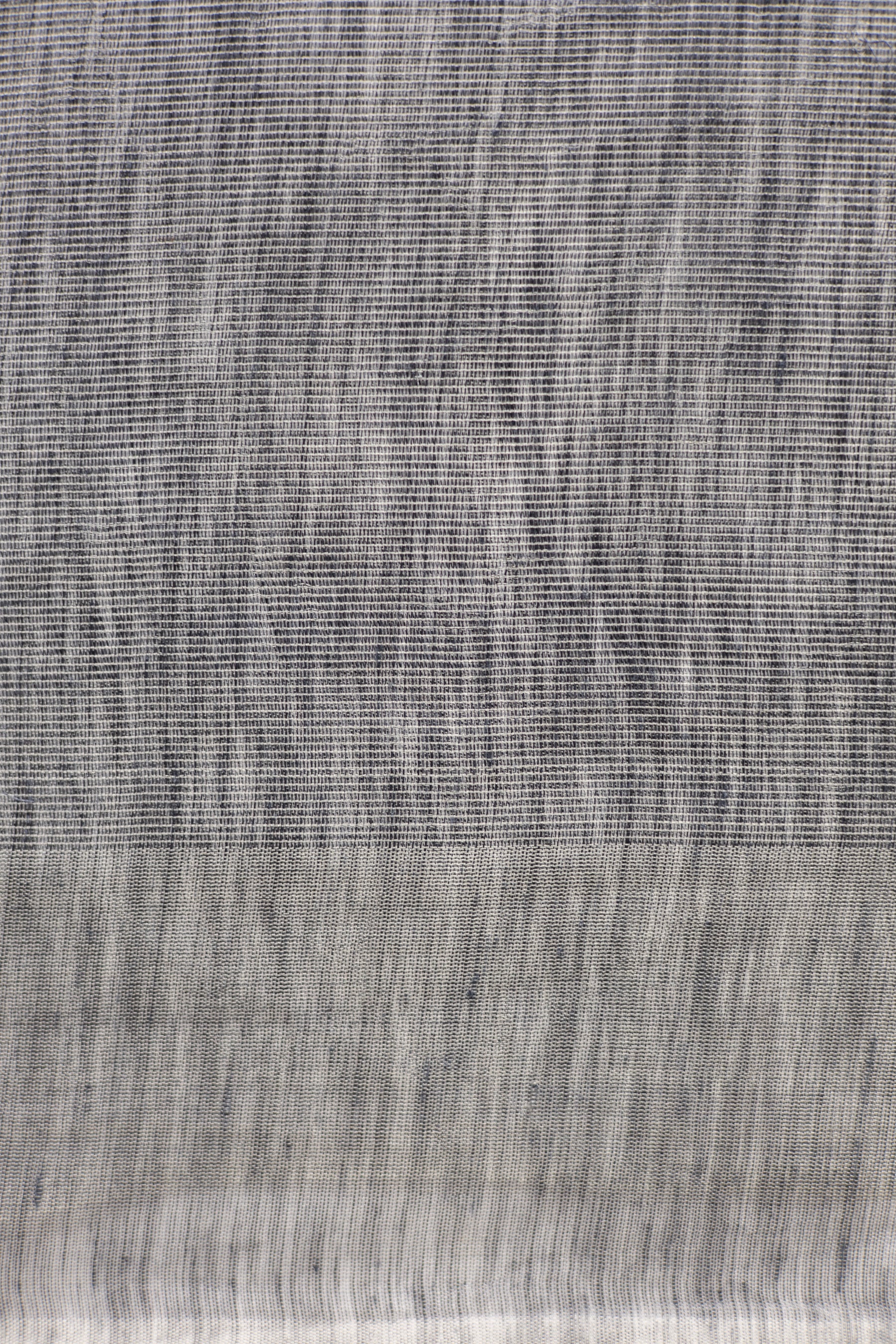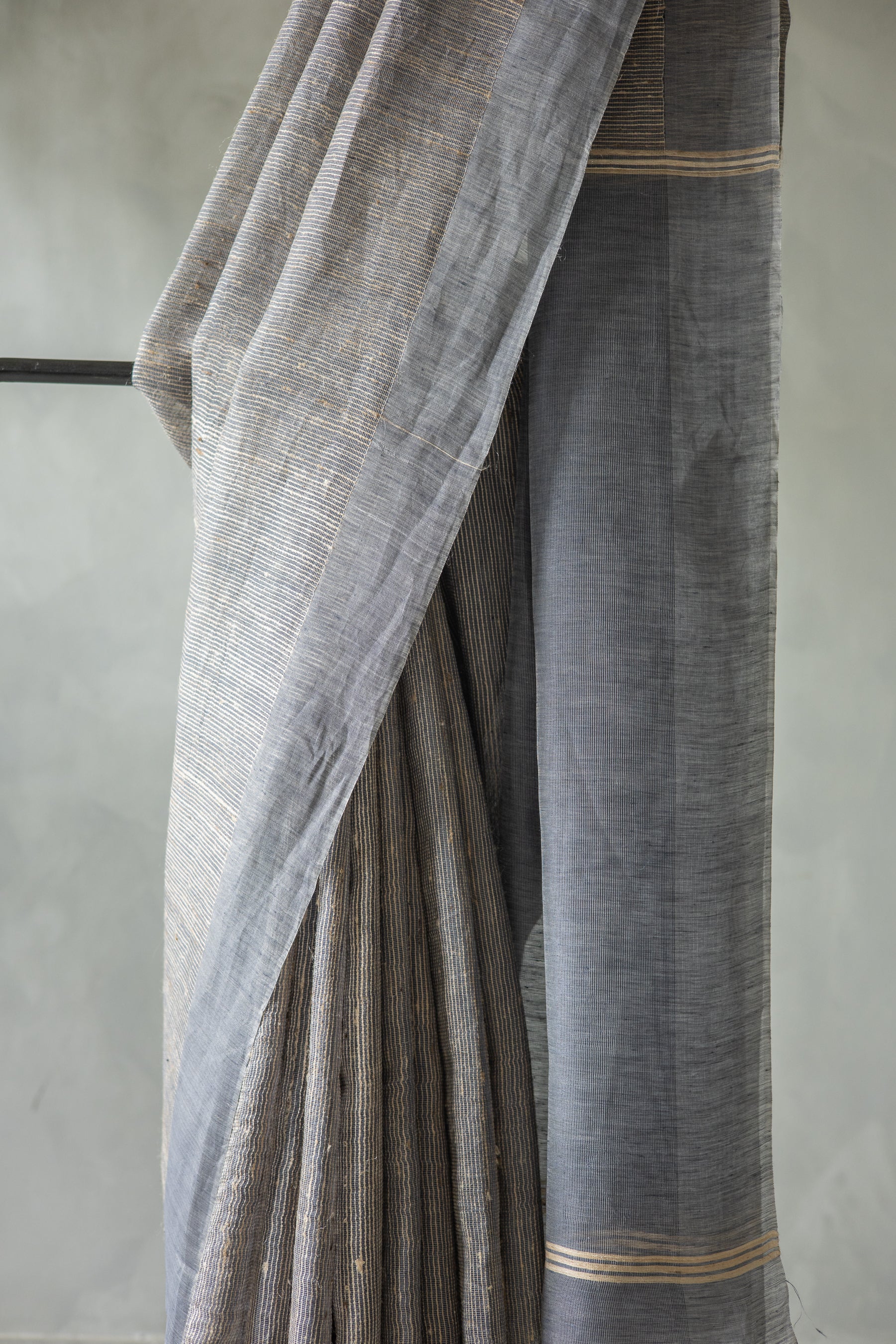 A grey linen–cotton saree featuring a dark grey woven border and coordinated pallu. The fabric blend offers a soft, breathable texture with moderate stiffness for structured drape. The saree is crafted on a powerloom with fine yarns for smooth fall and durability. The dark grey border and pallu use contrast weaving to enhance definition.