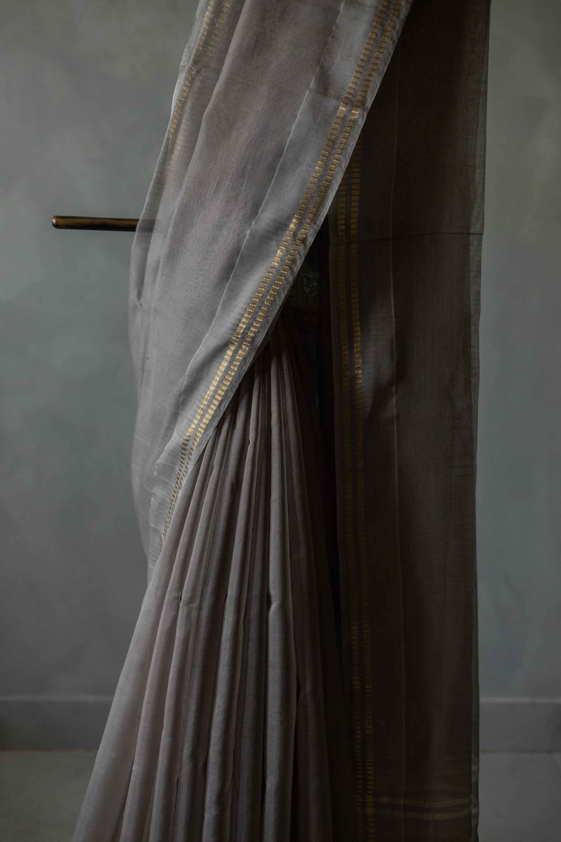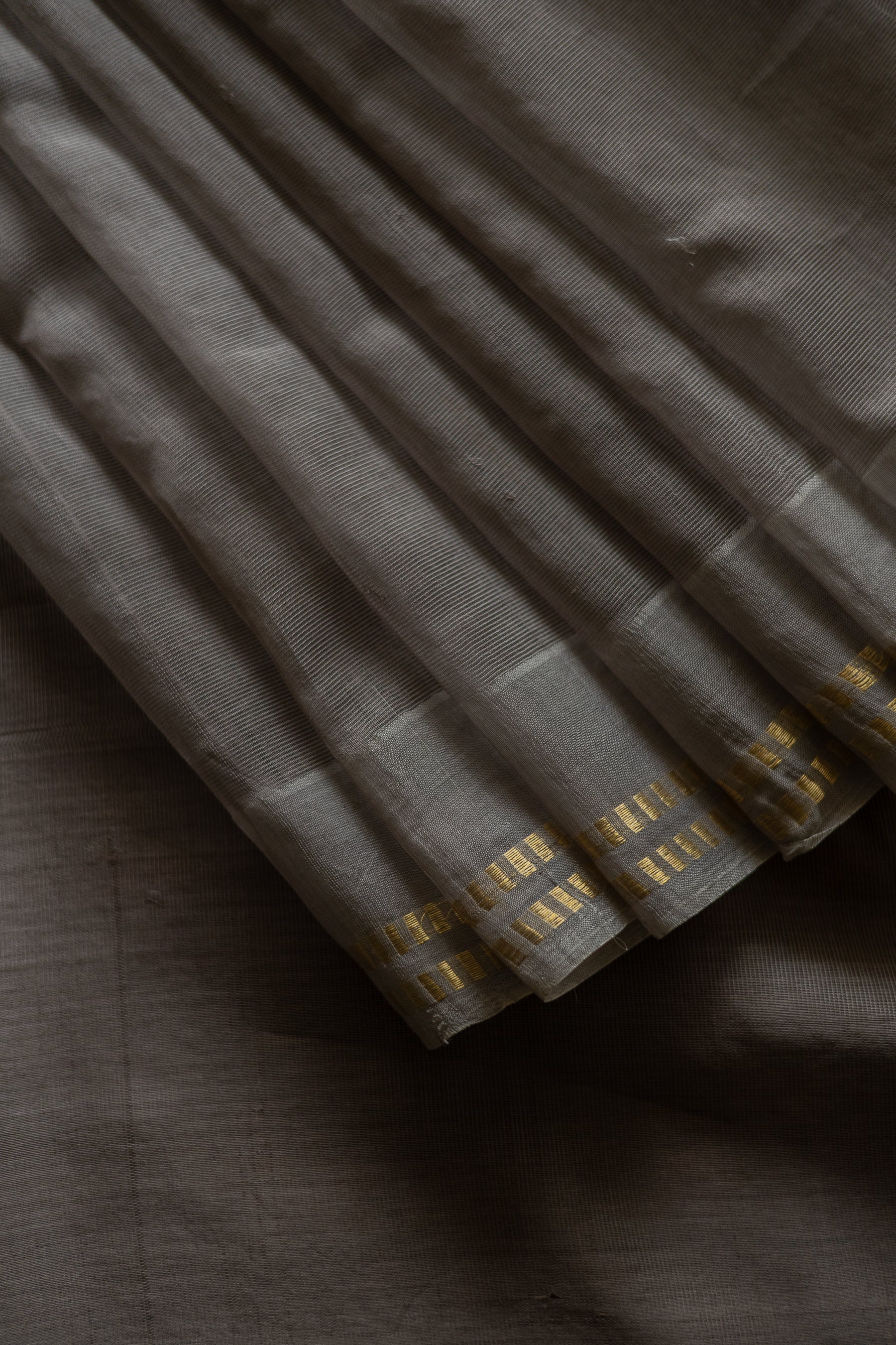 Grey Silk Cotton Saree features a refined blend of silk and cotton, offering both luxury and comfort. The saree is highlighted by a distinctive barcode zari border, adding a contemporary and striking touch to its traditional design. The rich grey color brings a sense of freshness and versatility, making it suitable for both festive occasions and casual gatherings. The lightweight and breathable fabric ensures easy draping and all-day comfort, while the bold zari border elevates the saree's overall appeal, making it a statement piece for any wardrobe.