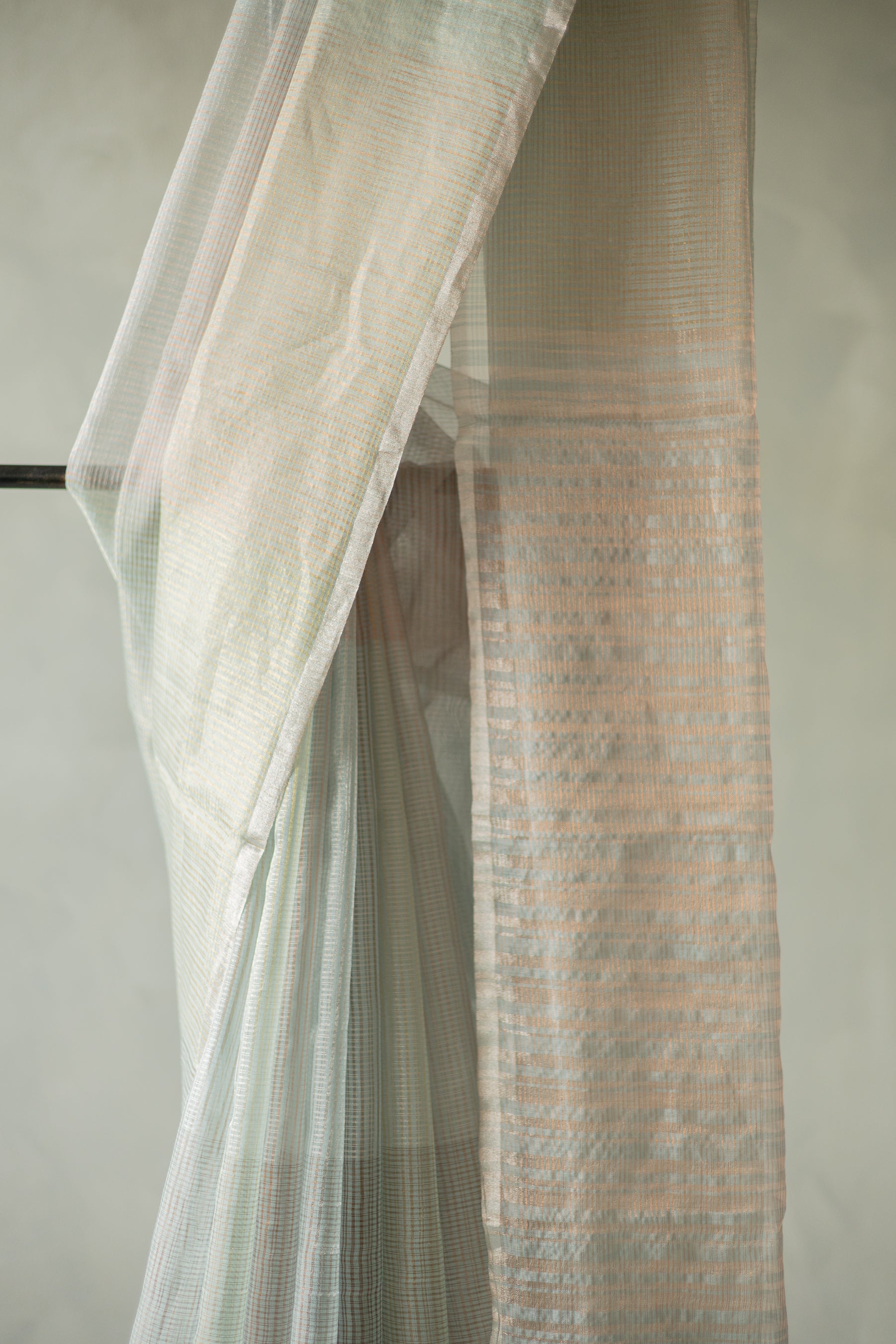 A Light Blue Silk Cotton saree featuring an intricate all-over pattern of woven stripes and checks that add subtle texture and visual rhythm to the body. Crafted from a blend of silk and cotton, the fabric offers a soft sheen with breathable comfort. Lightweight and elegant, this saree is ideal for daytime occasions, offering a refined balance of traditional design and contemporary appeal.