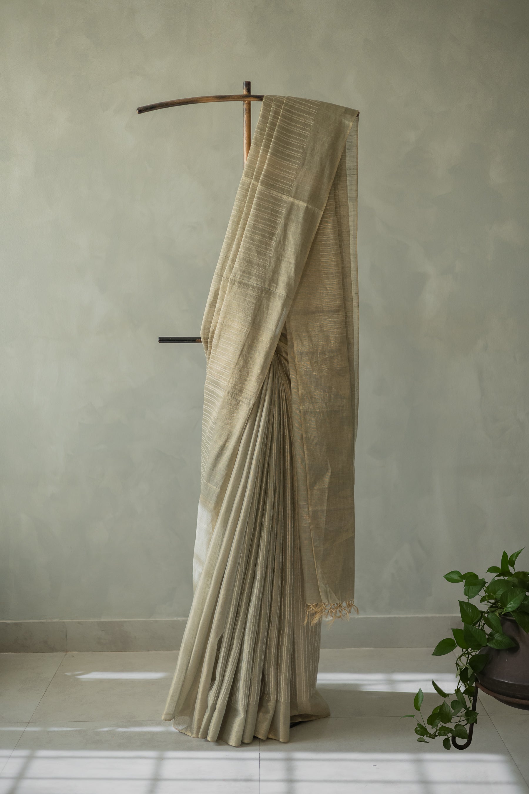 Light Grey Tussar Handspun Tissue All Over Striped Saree