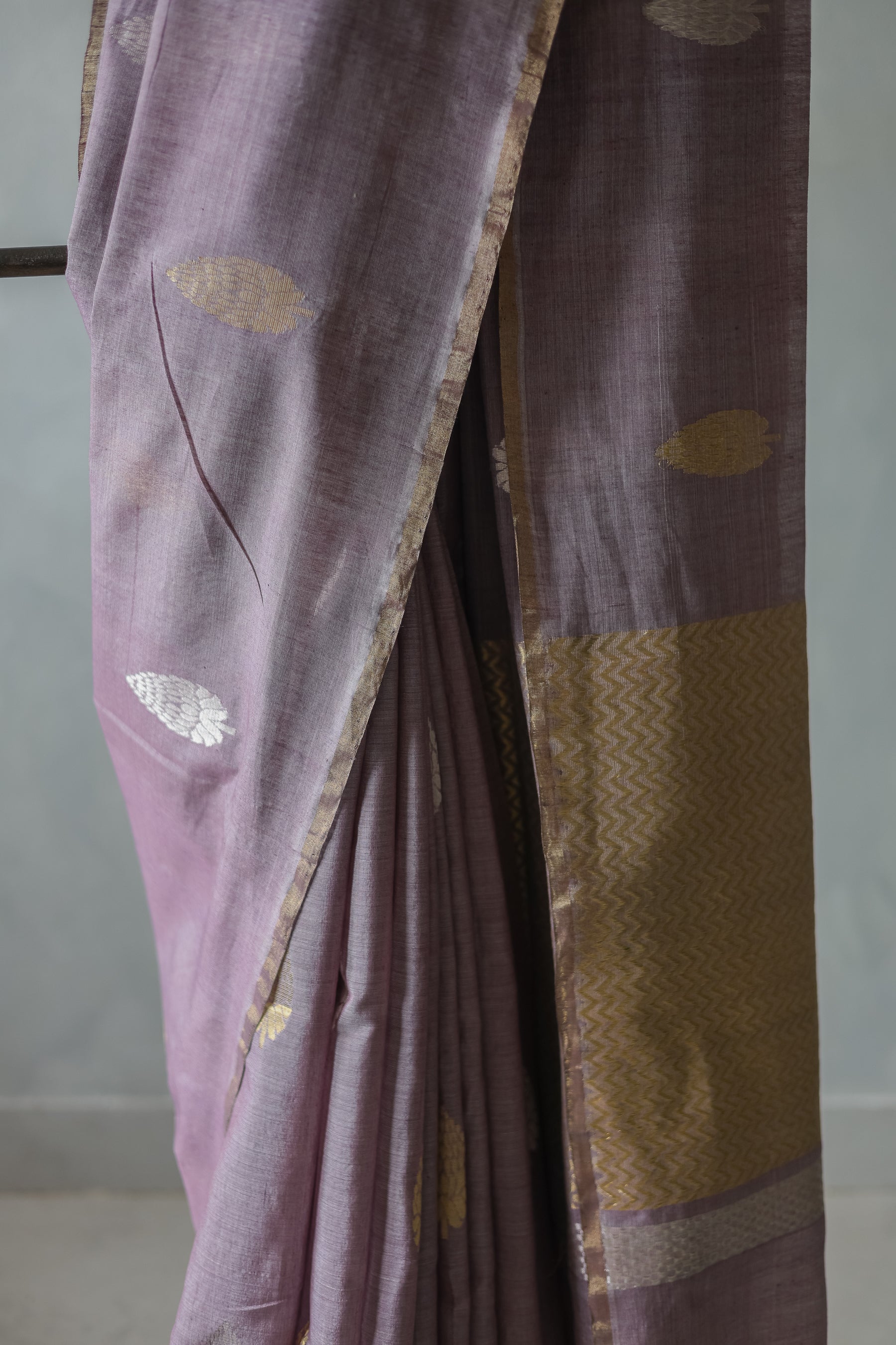 Light Purple saree adorned with all-over delicate flower motifs. The handwoven fabric provides a soft, breathable texture, making it ideal for comfortable wear throughout the day. The intricate floral motifs add a subtle elegance, perfect for both casual and formal occasions. This saree effortlessly blends traditional charm with a timeless, graceful design.