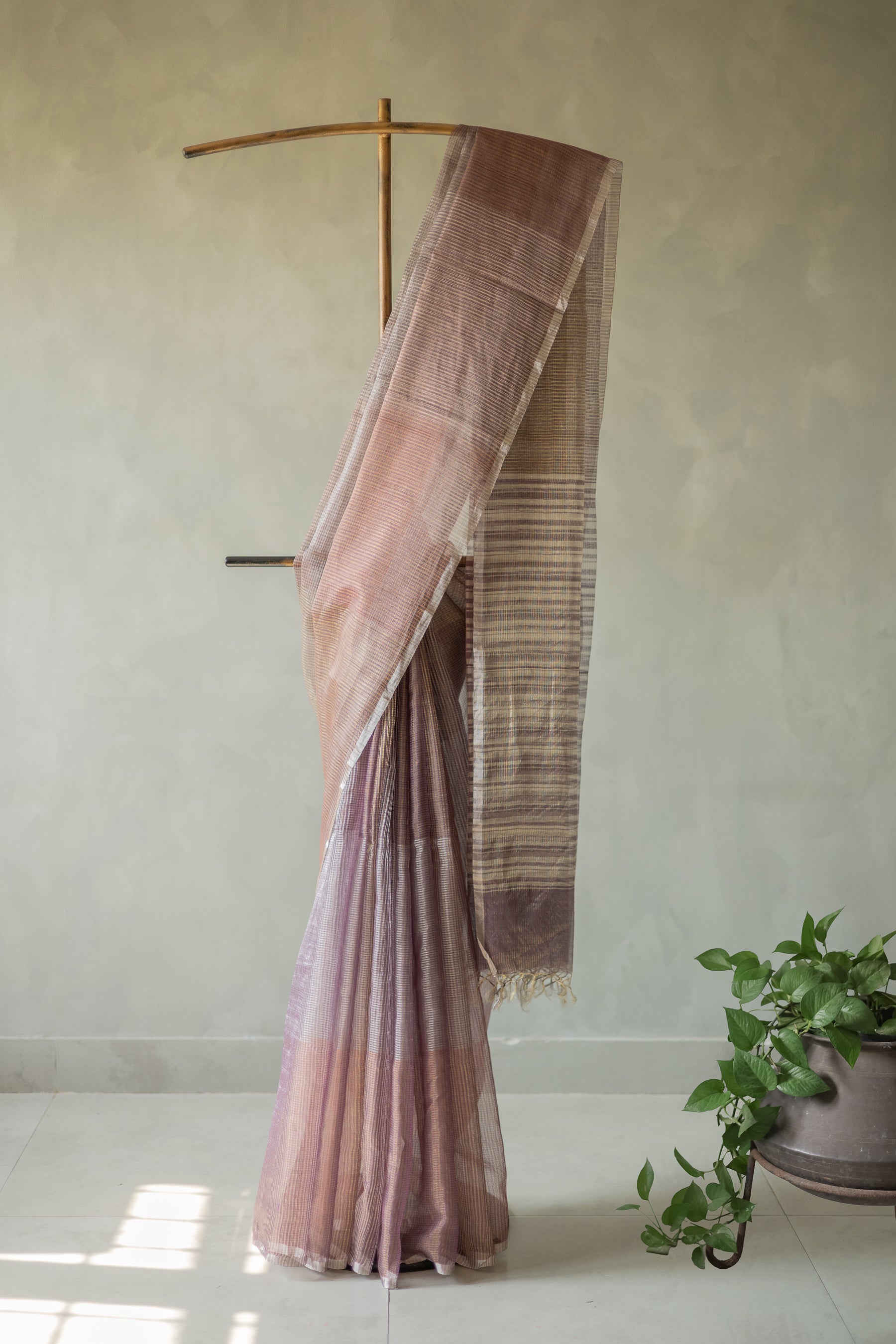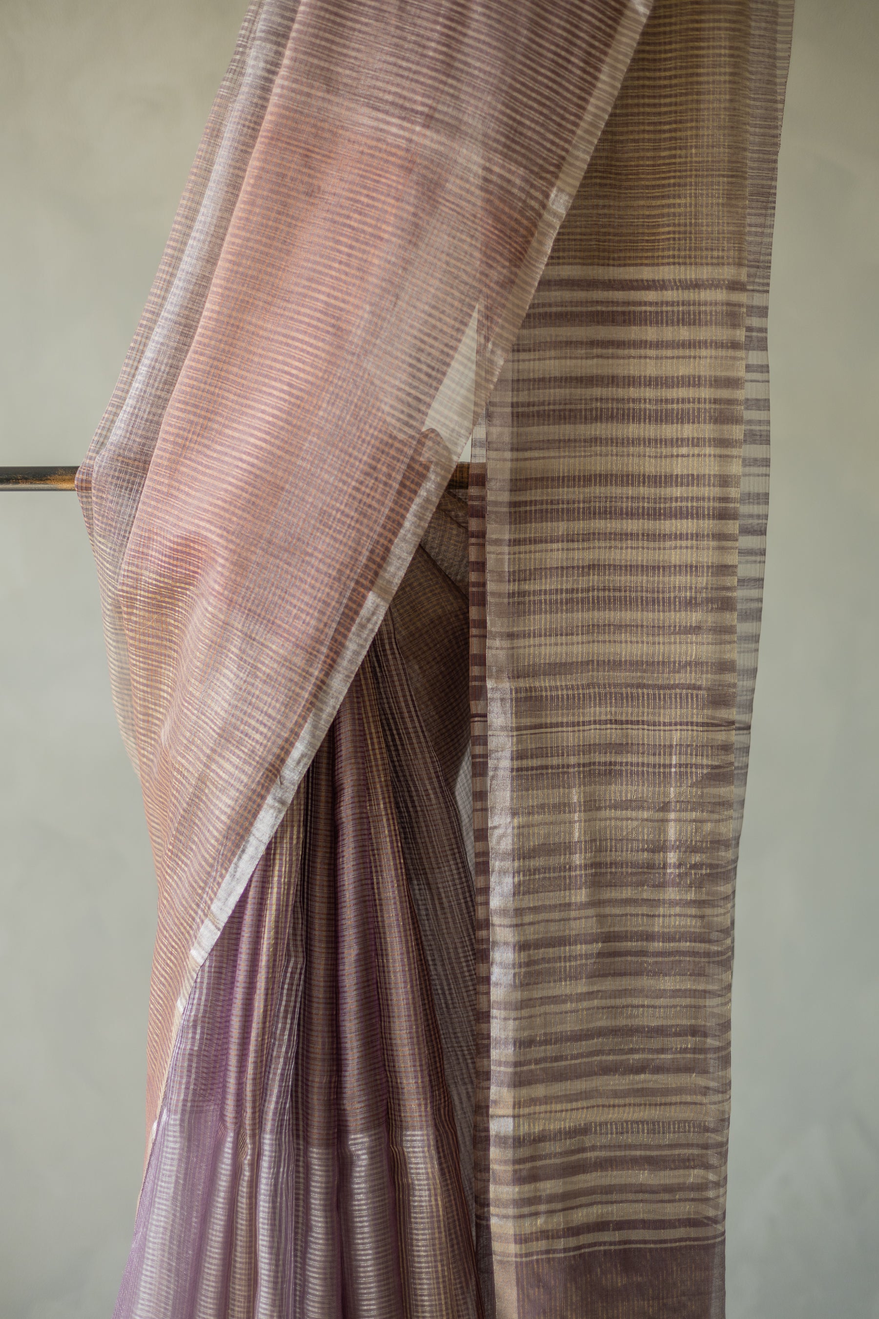 This light purple silk cotton saree features an elegant mix of all-over stripes and checks, creating a subtle yet stylish pattern. The soft, breathable fabric offers comfort while maintaining a graceful drape, making it perfect for both casual and semi-formal occasions.