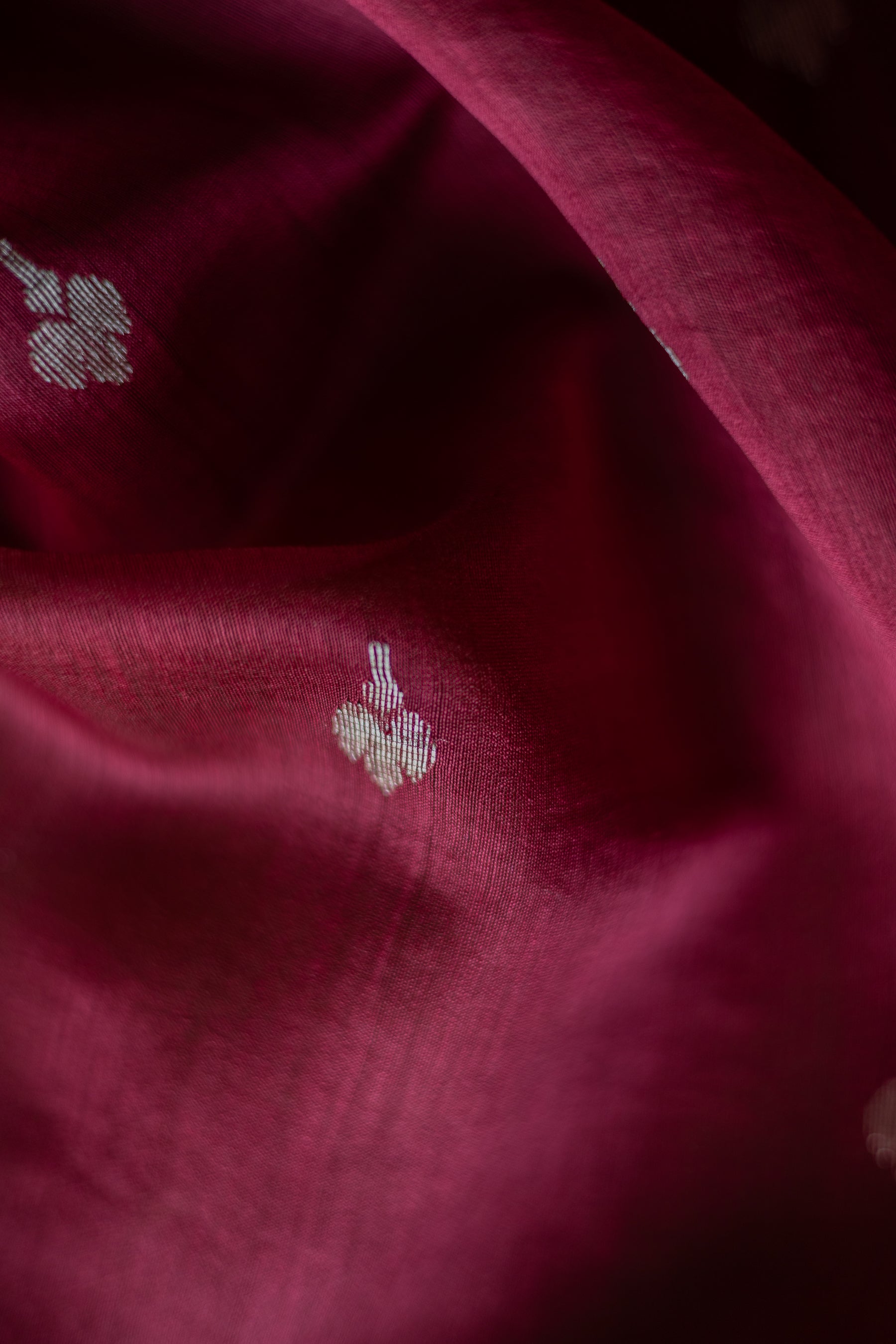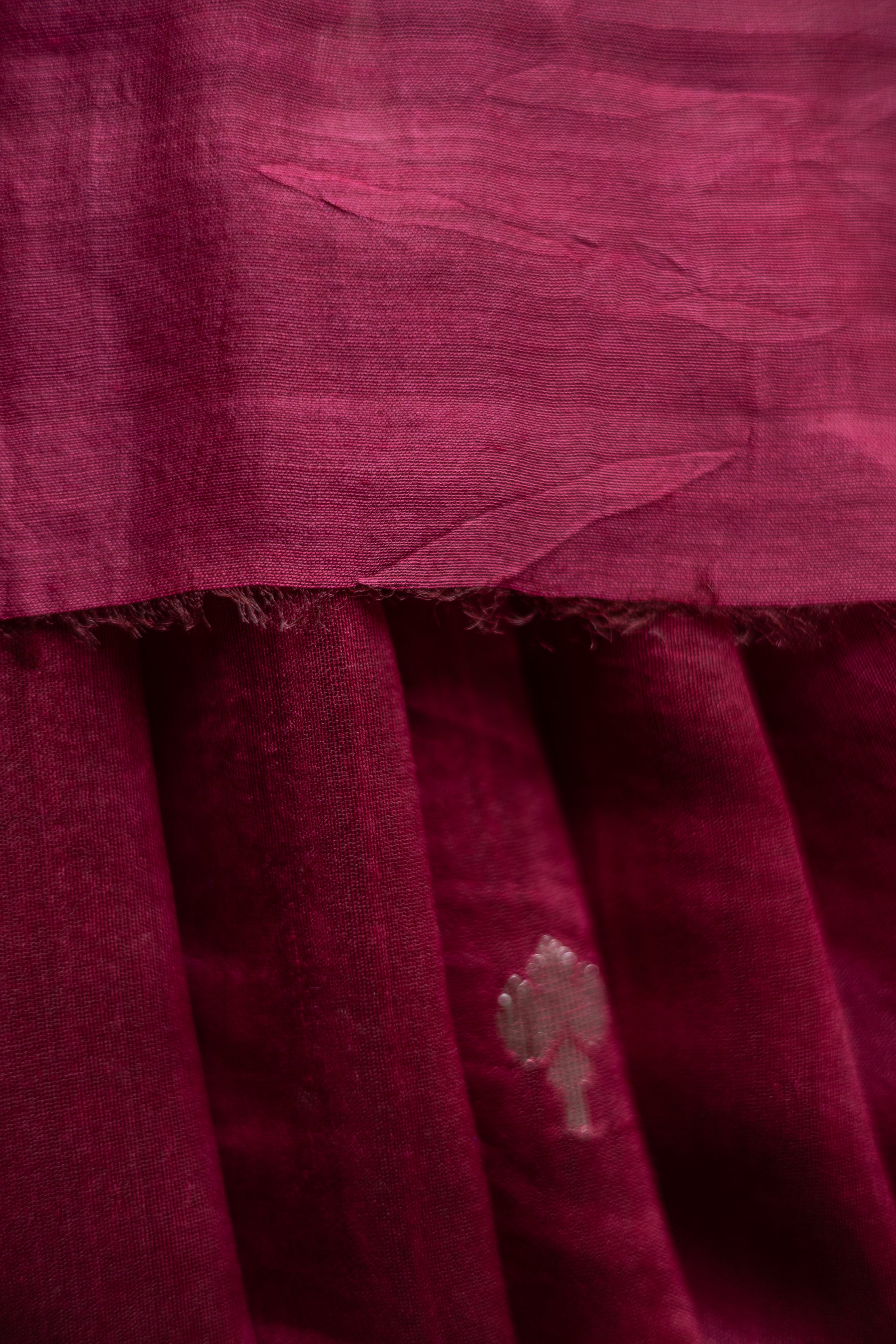 This maroon organza tissue saree is adorned with delicate silver motifs across the body, adding a refined shimmer to its lightweight, translucent fabric. Finished with an elegant silver border, the saree blends rich color with subtle metallic detailing, making it a perfect choice for festive occasions, evening events, and celebrations.