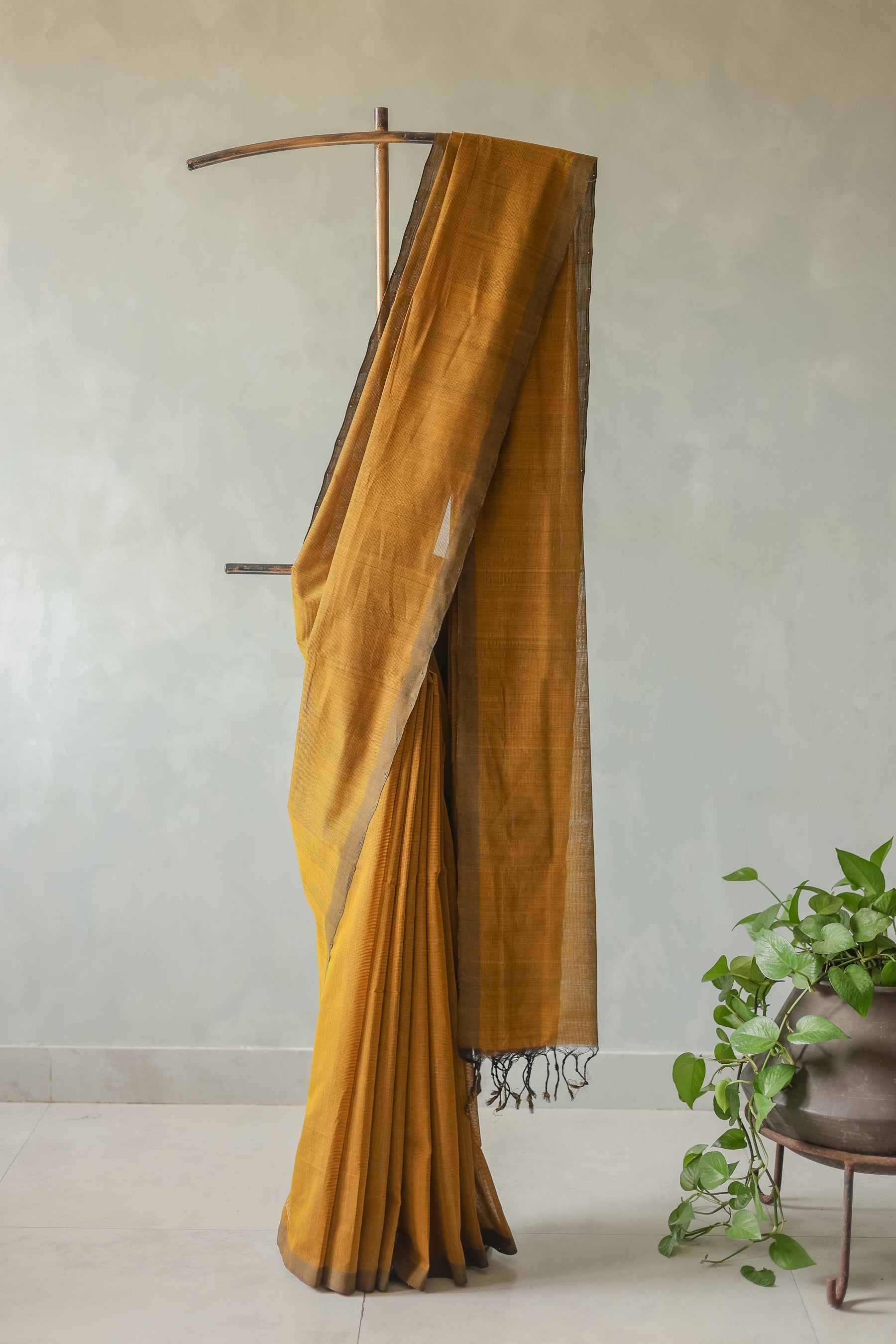 Mustard and Brown Border Plain Mangalagiri Cotton Saree