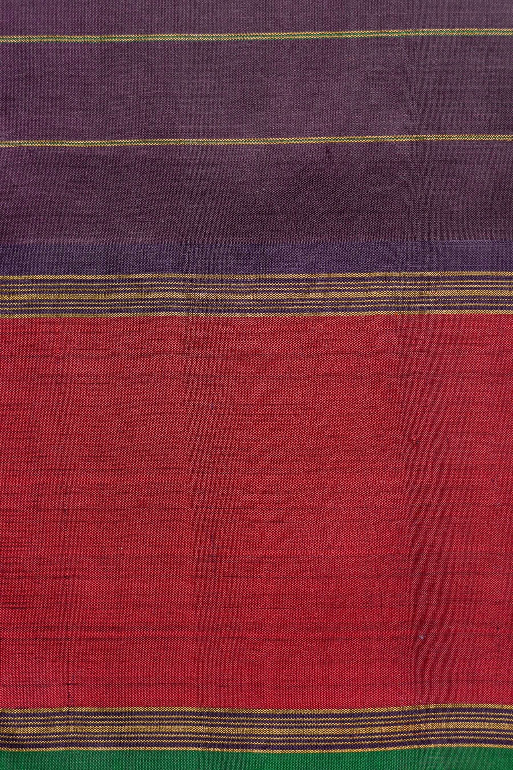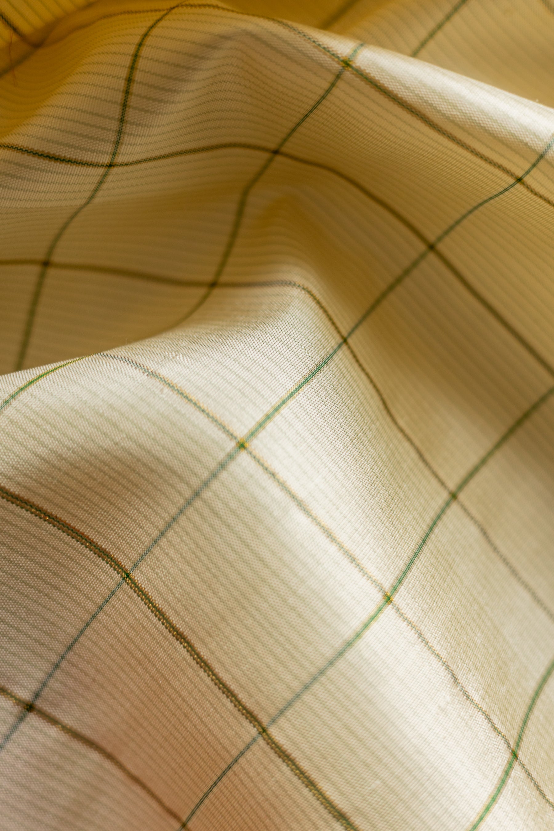 An off-white Kanjivaram silk saree featuring all-over woven checks that add subtle structure and classic detailing to the body. The contrasting red border provides bold definition, highlighted with traditional zari motifs. The saree exhibits a rich lustre and a crisp, firm drape. Its understated checked body balanced with the striking border reflects timeless Kanjivaram aesthetics.