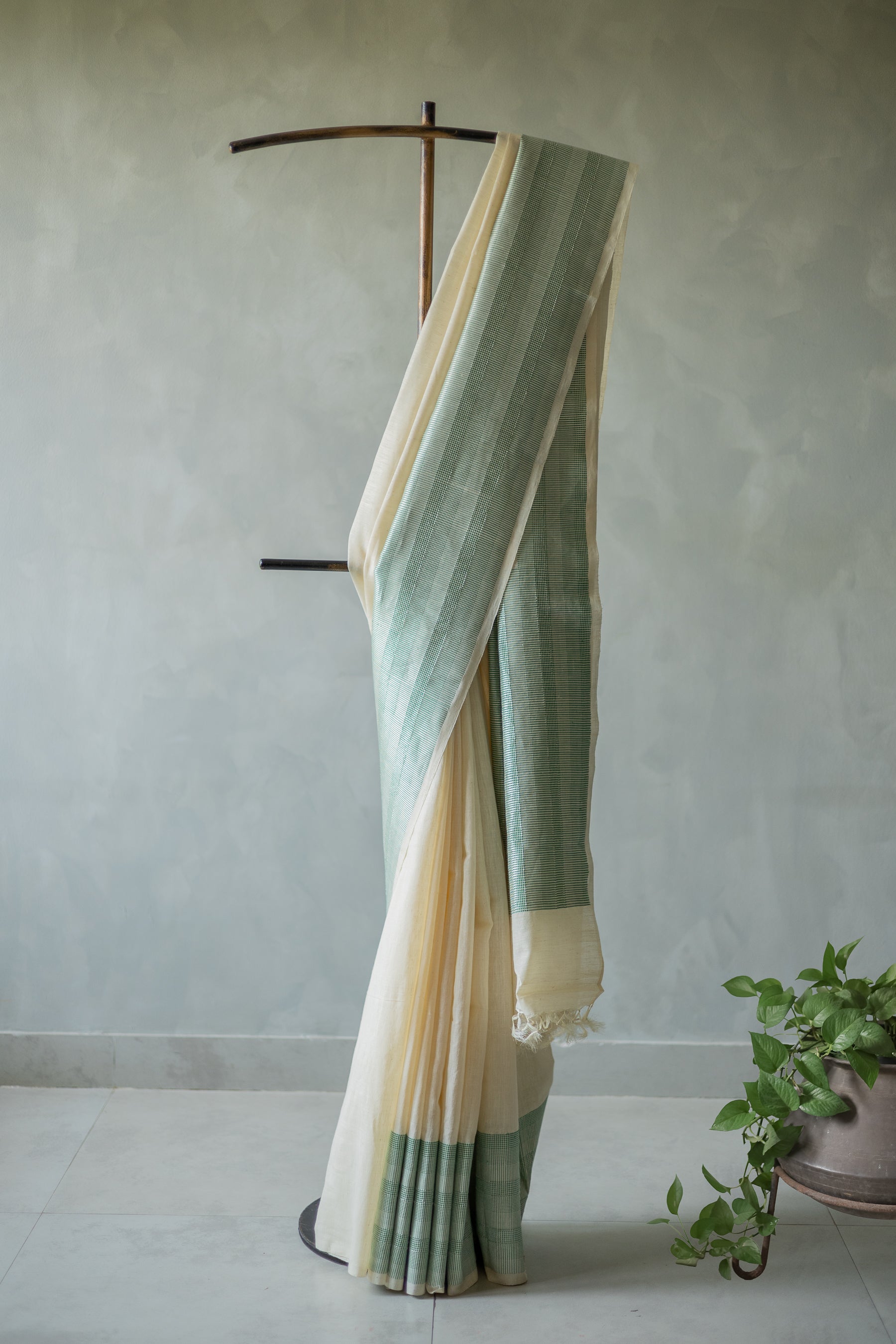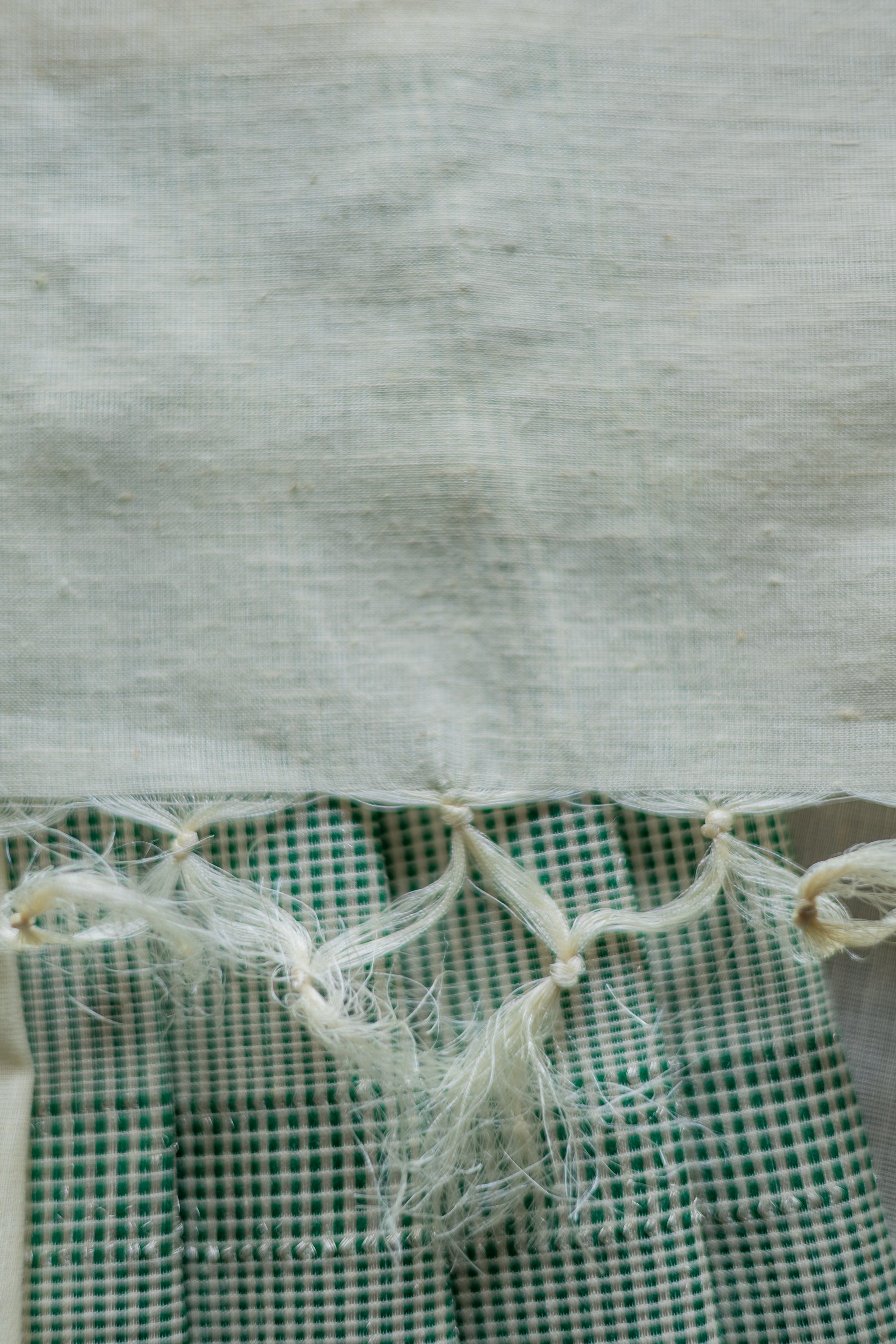 This off-white handspun saree features a clean, textured body complemented by a green checks border that adds a subtle pop of color. The natural feel of the handspun fabric combined with the minimal design makes it a perfect choice for understated, everyday elegance or casual traditional wear.