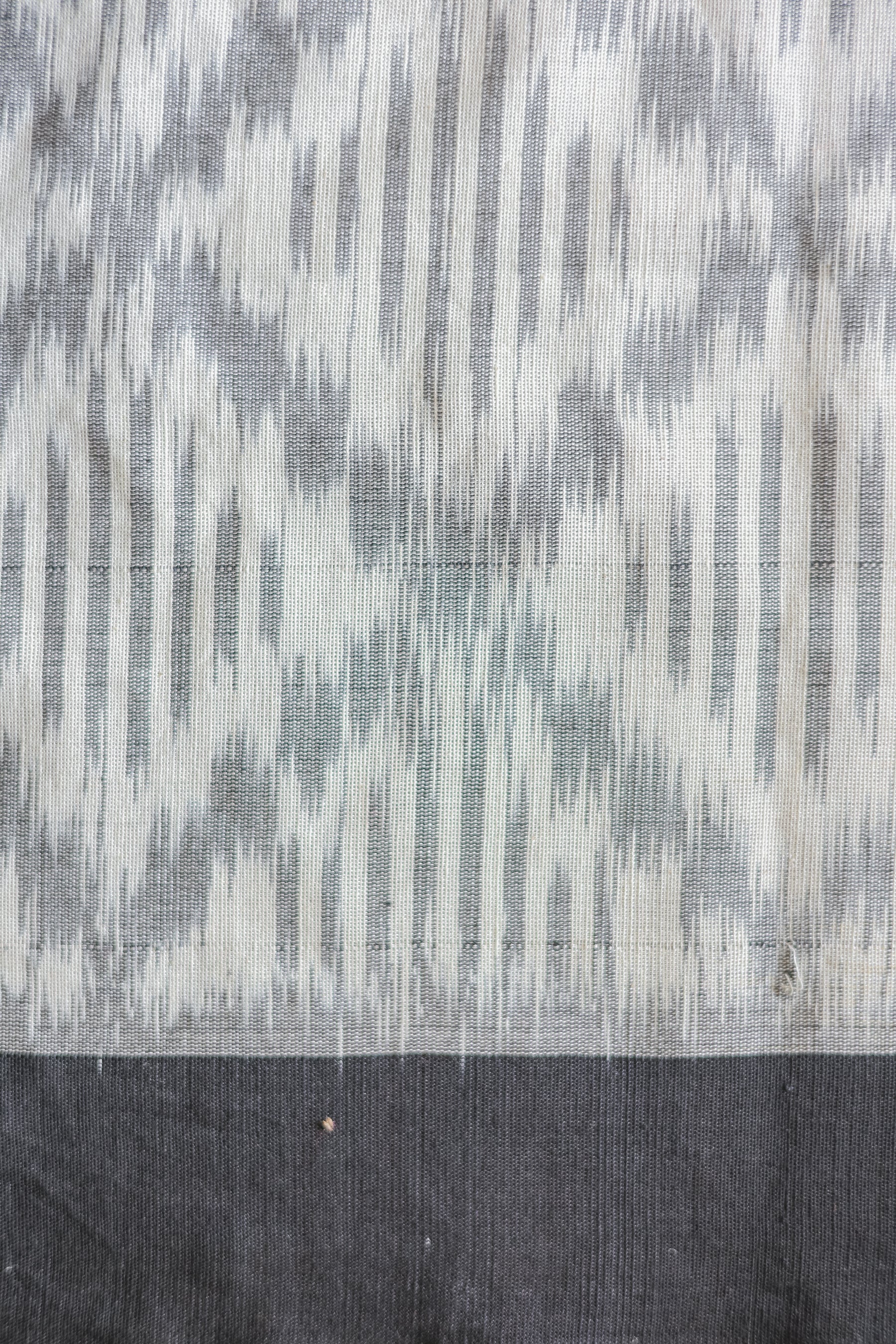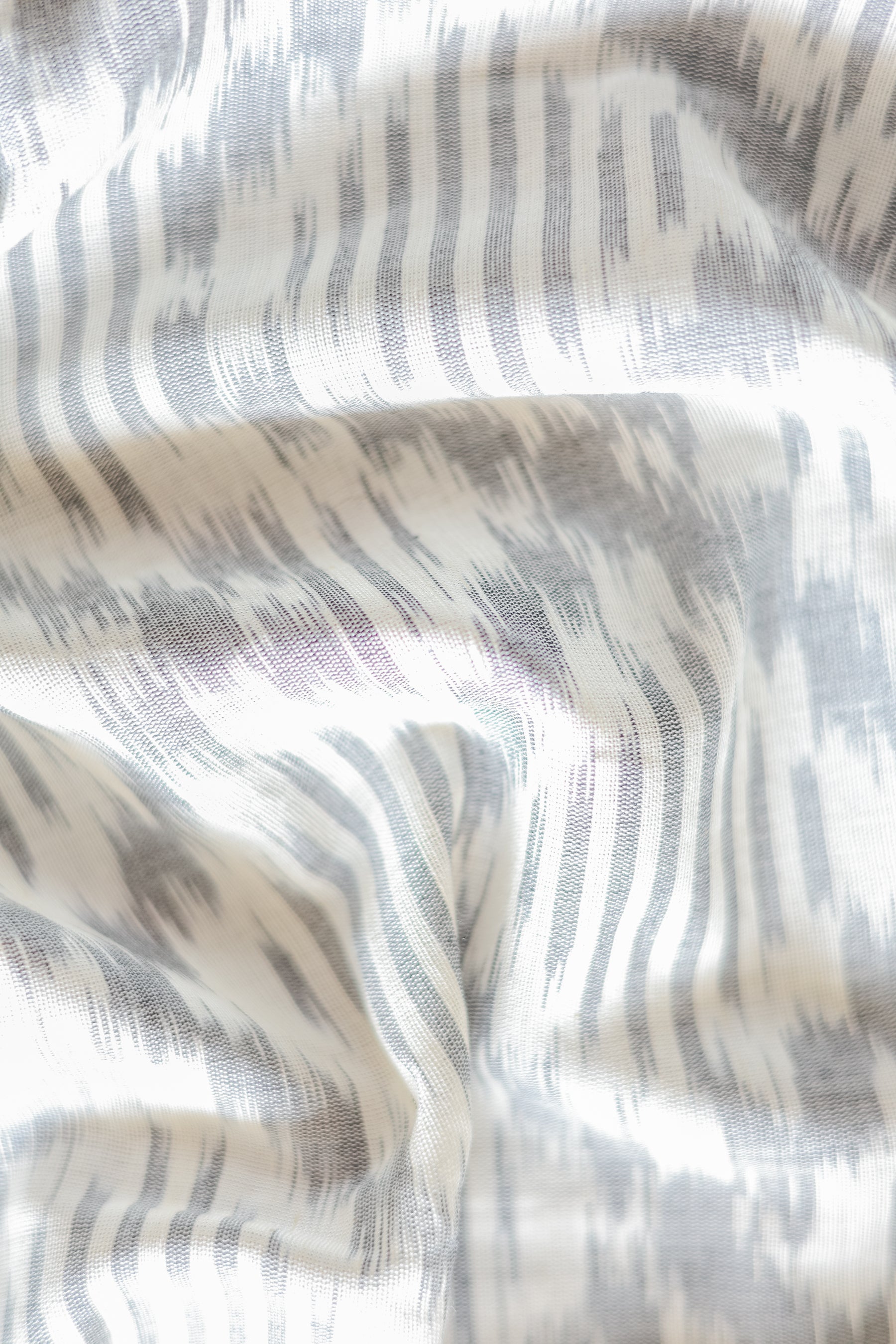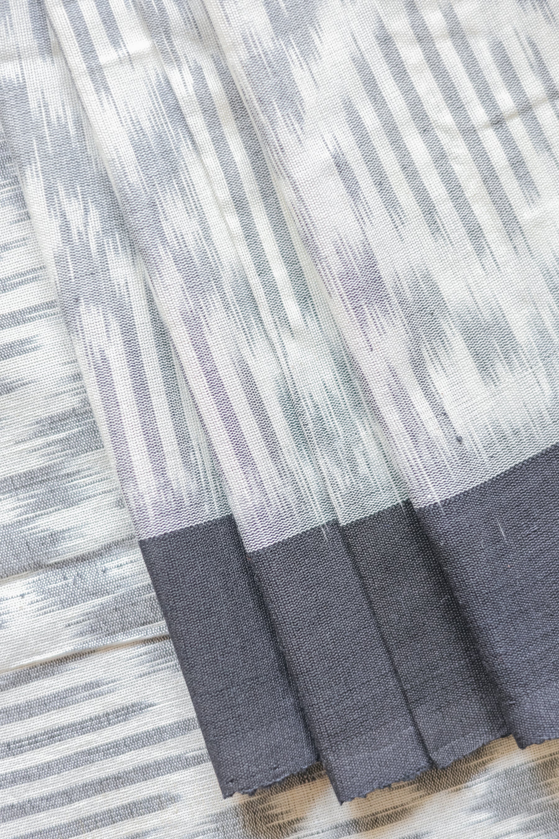 A subtle off-white ikat cotton saree adorned with fine handwoven patterns that lend it a soft, artisanal charm. It is delicately framed with a small black border that adds a hint of contrast without overpowering the understated body. Crafted from breathable cotton, the saree offers a light and comfortable drape, making it perfect for everyday wear and relaxed occasions. The pallu continues the minimal black detailing, completing the look with quiet elegance.