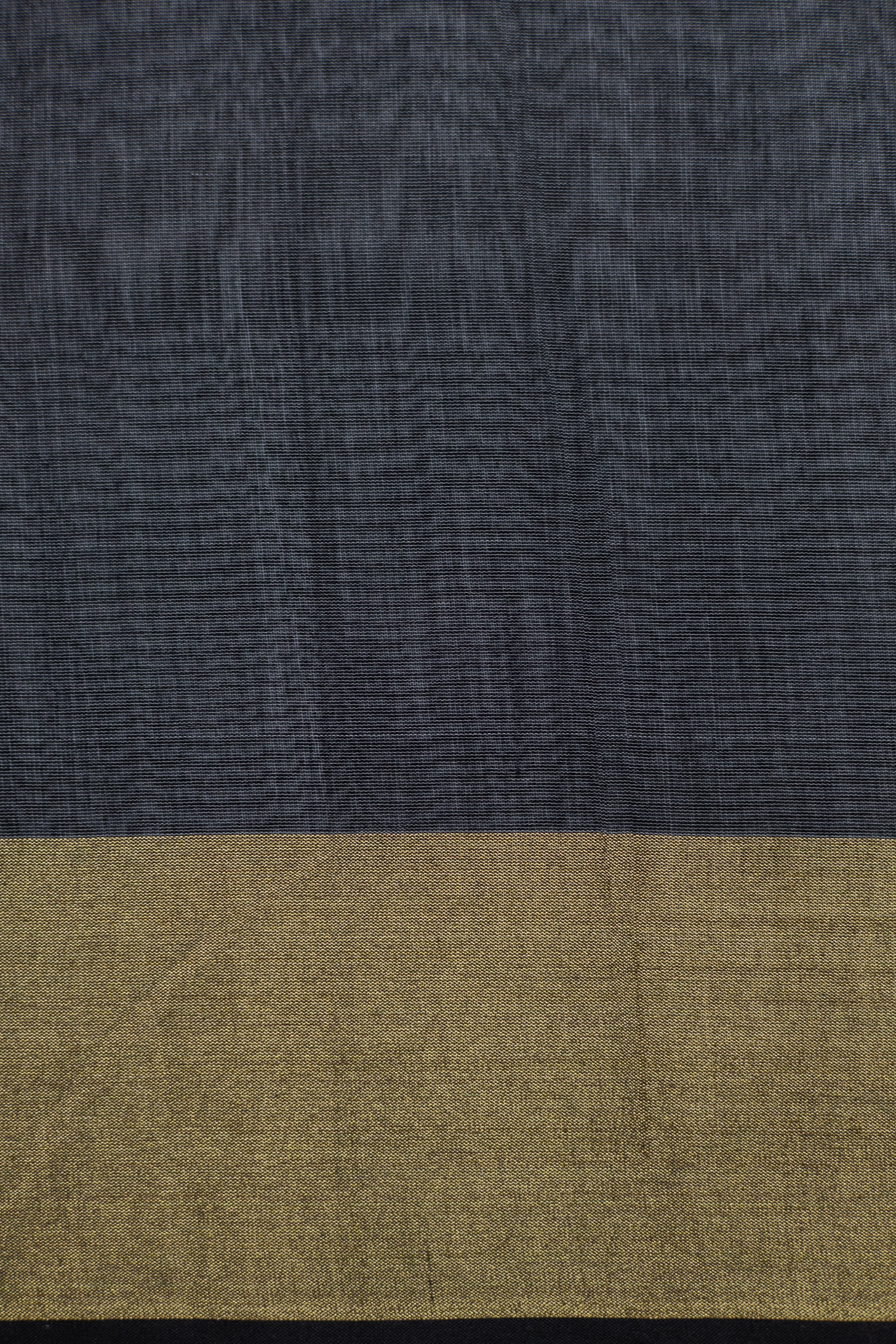 This saree woven with a fine silk warp and soft cotton weft, creating a lightweight drape with a gentle sheen. The body features intricately placed triangle motifs formed using contrast thread interlocking. The edges are finished with a rich golden zari border woven on the shuttle loom, adding structure and a traditional finish. The saree is completed with a matching running blouse in the black silk-cotton fabric.