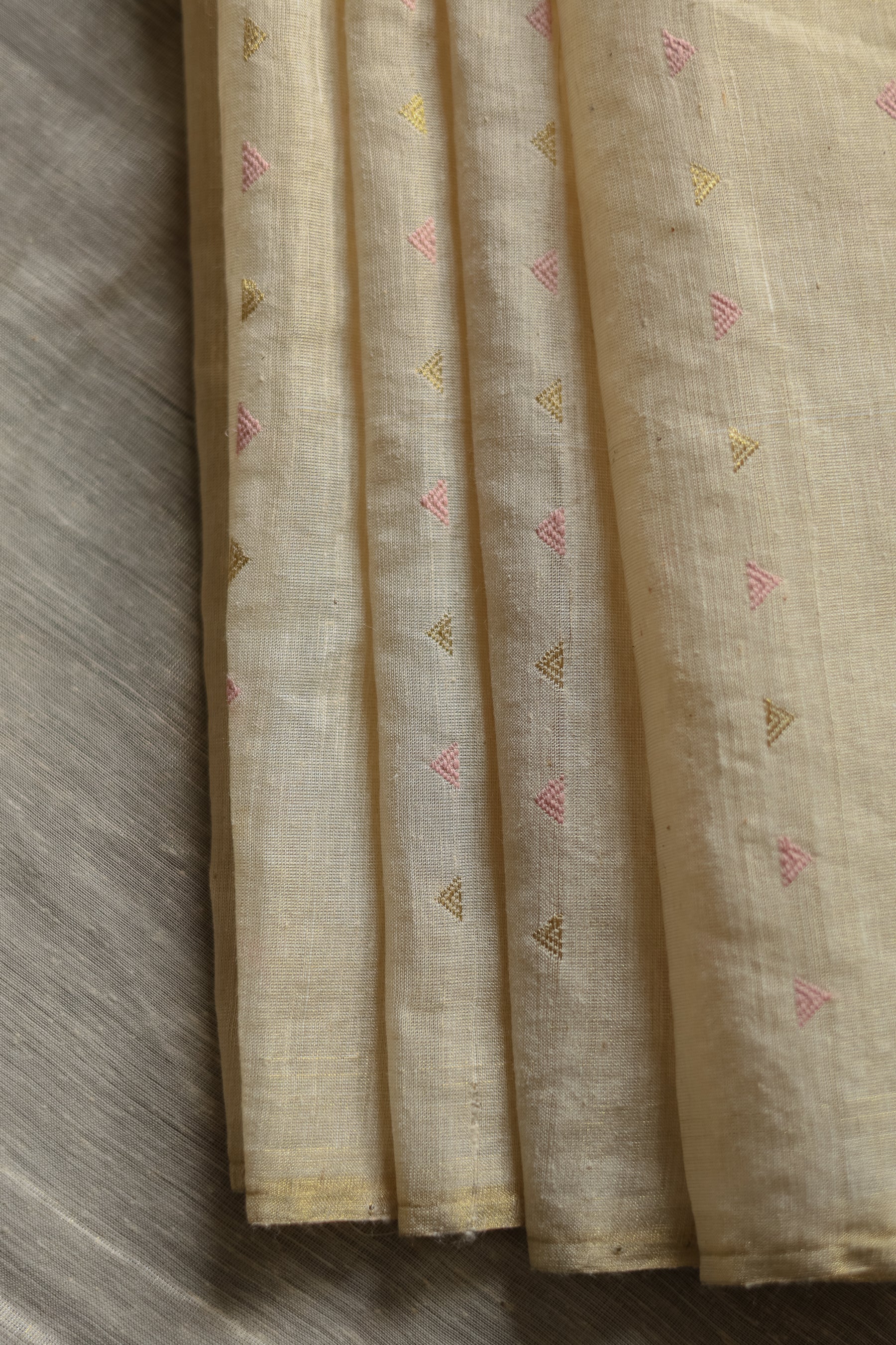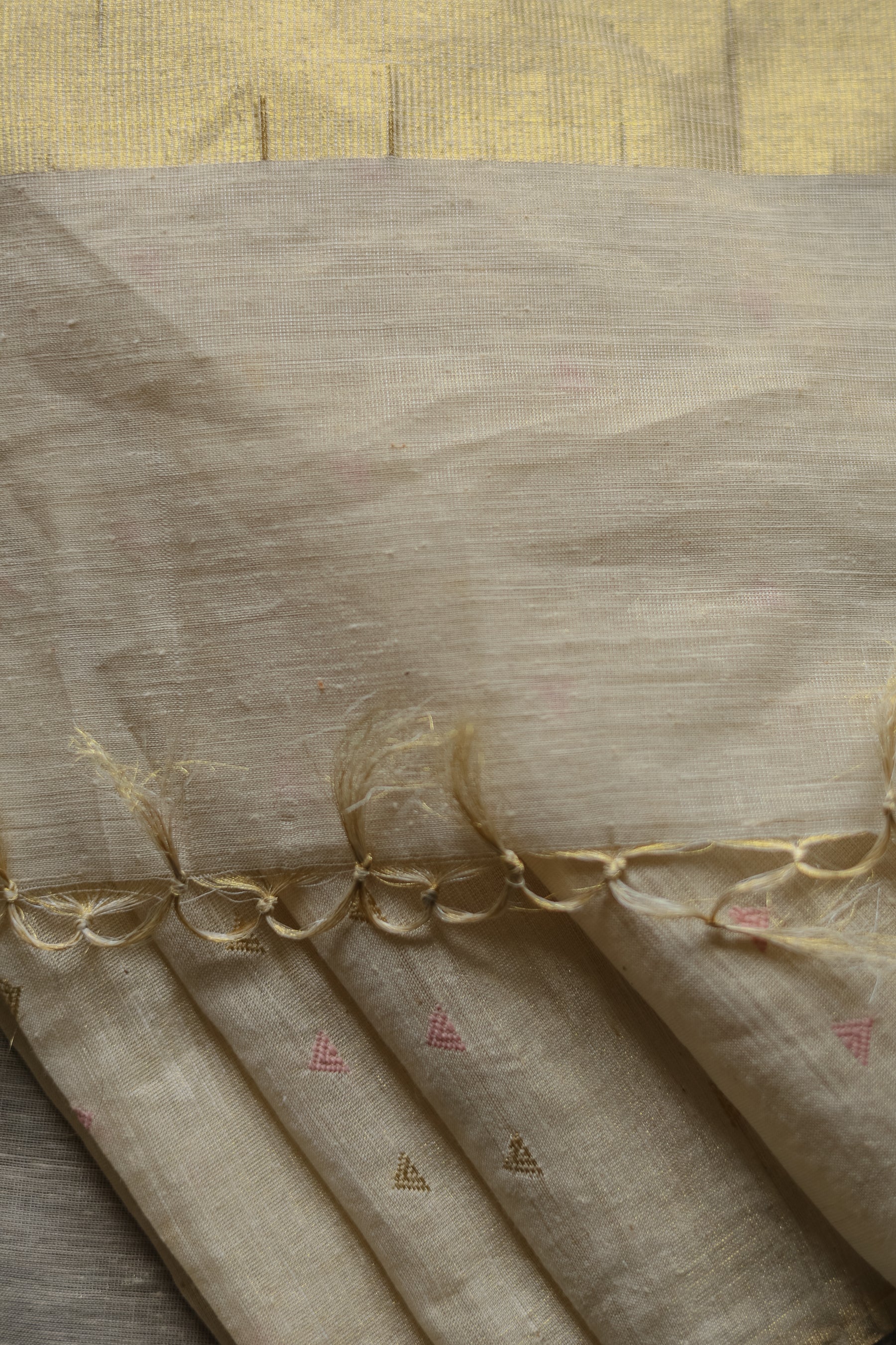 Off White Tussar with Pink and Gold Triangle Woven Motif Saree