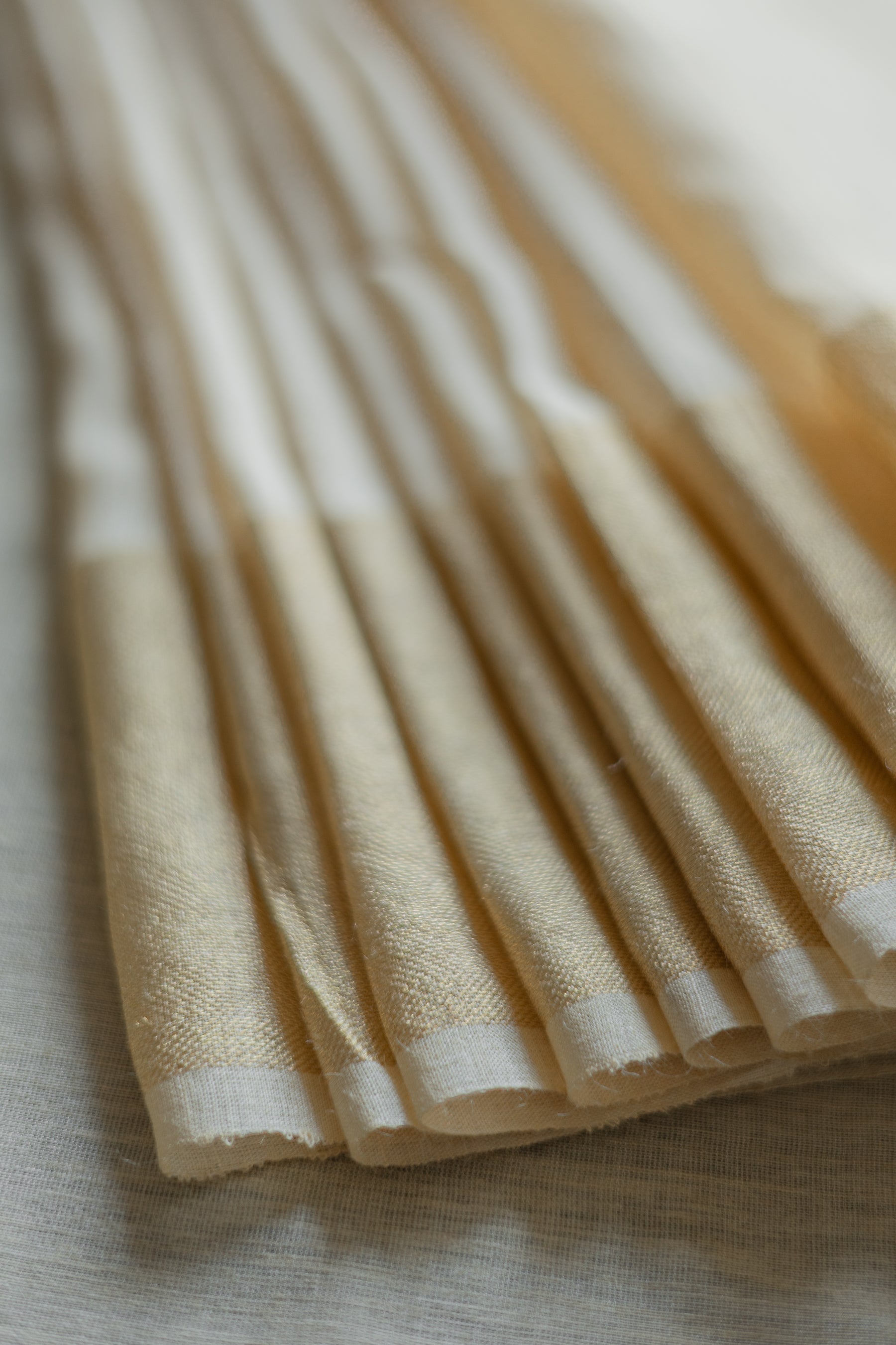 Elevate your ethnic wardrobe with this exquisite Off White Tussar Muga Saree, crafted for timeless elegance. Woven from rich Tussar Muga silk, this saree features a classic plain body that highlights the natural texture and sheen of the fabric. The subtle off-white hue is beautifully complemented by a lustrous gold border, adding a touch of refined luxury without overpowering the simplicity of the design. Perfect for festive occasions, cultural gatherings, or elegant day events, this saree offers effortless grace and sophistication.