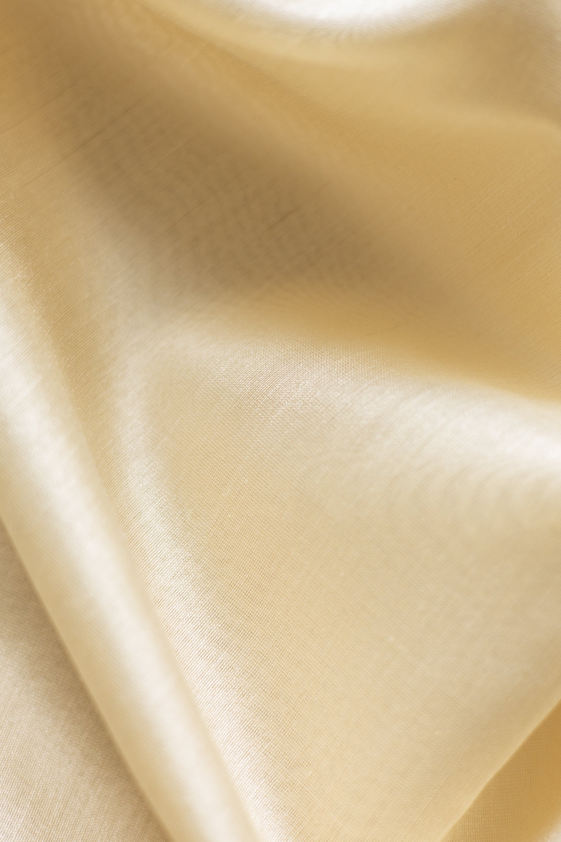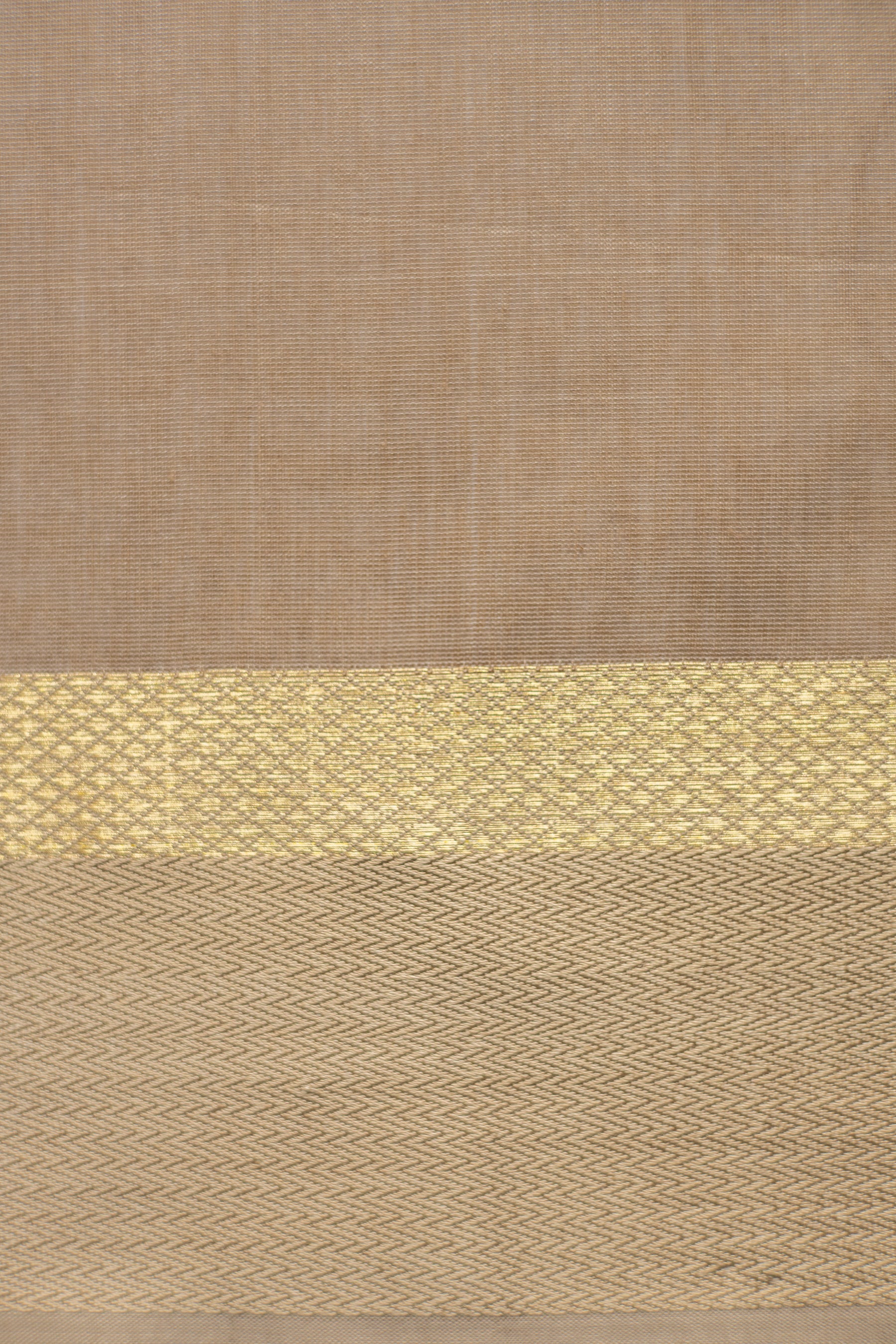 This saree woven in a soft silk-cotton blend, giving a lightweight, smooth texture with a gentle sheen. The body is plain for an elegant minimal look, finished with a beige woven border that adds subtle contrast and structural definition. The pallu features coordinated beige stripes created through precision weft patterning, enhancing the overall linear design. The saree has a crisp, graceful drape