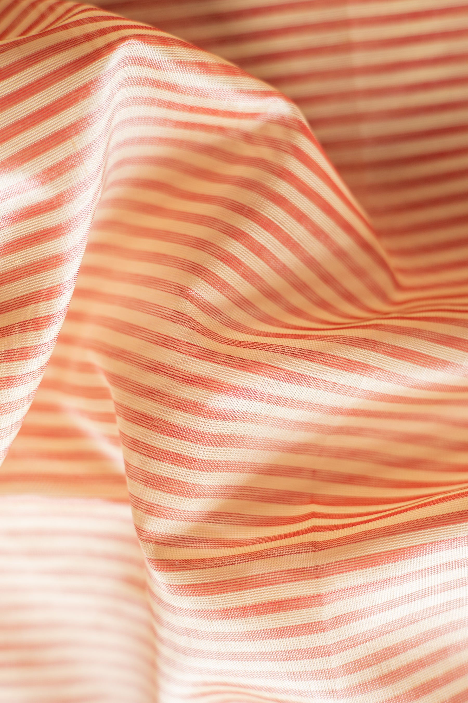 This saree woven with a silk warp and cotton weft, giving a soft sheen with a lightweight, breathable hand feel. The body features fine alternating stripes for a subtle textured effect. The mustard temple border is crafted using precise extra-weft weaving, adding structural definition and traditional geometric detailing. The pallu continues in matching mustard with aligned temple motifs for visual continuity.