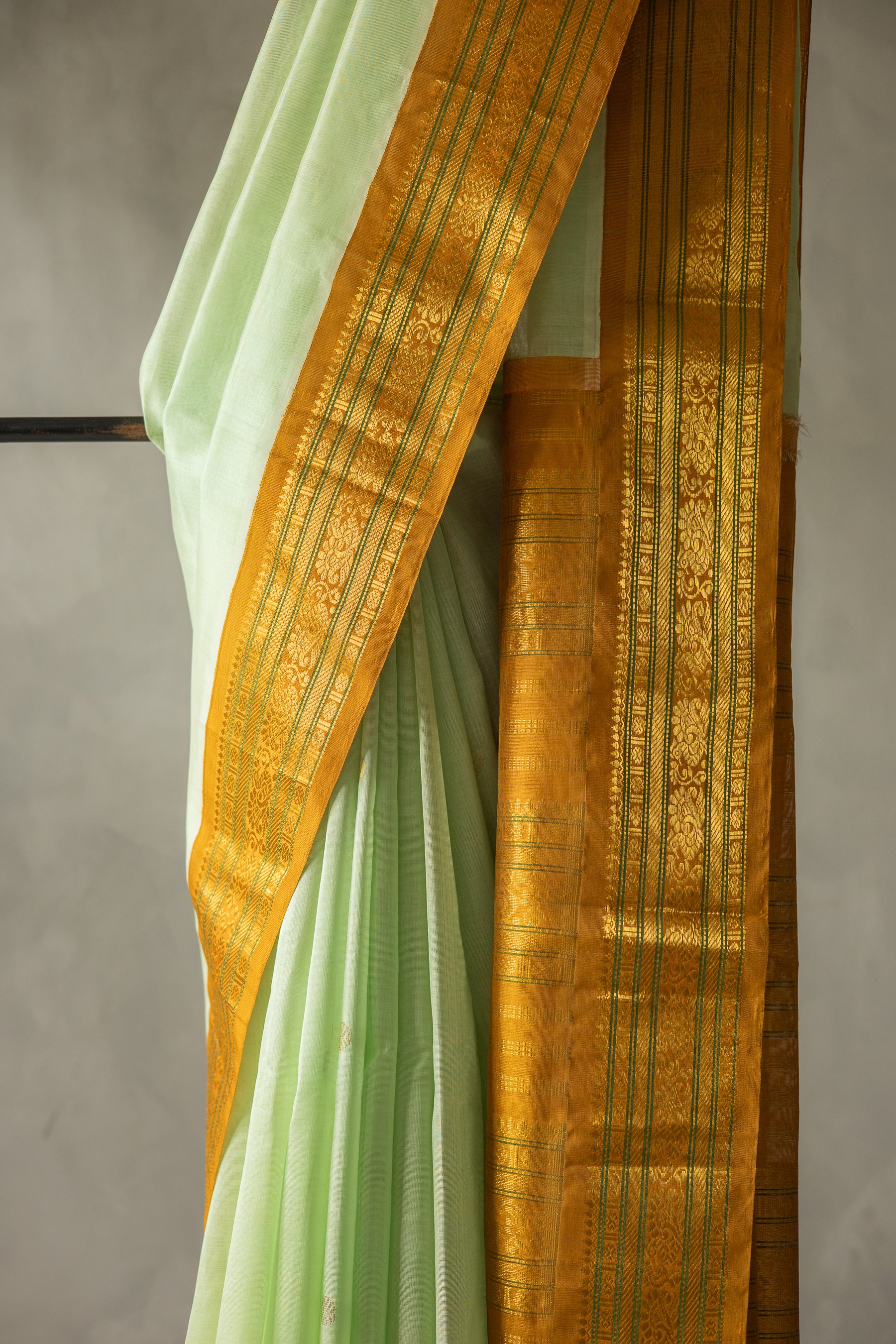 Pista Green Silk Cotton with Gold Motif and Traditional Border Saree