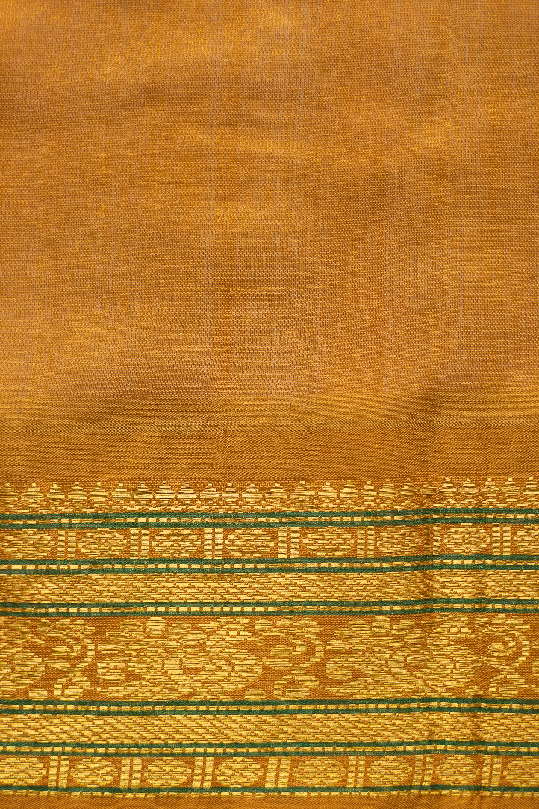 Pista green silk-cotton saree featuring woven gold motifs, crafted in a smooth, lightweight silk-cotton blend for a soft drape and subtle sheen. Designed with a traditional contrasting border enriched with intricate zari work, adding definition and elegance. The pallu carries coordinated woven detailing to complete the classic look