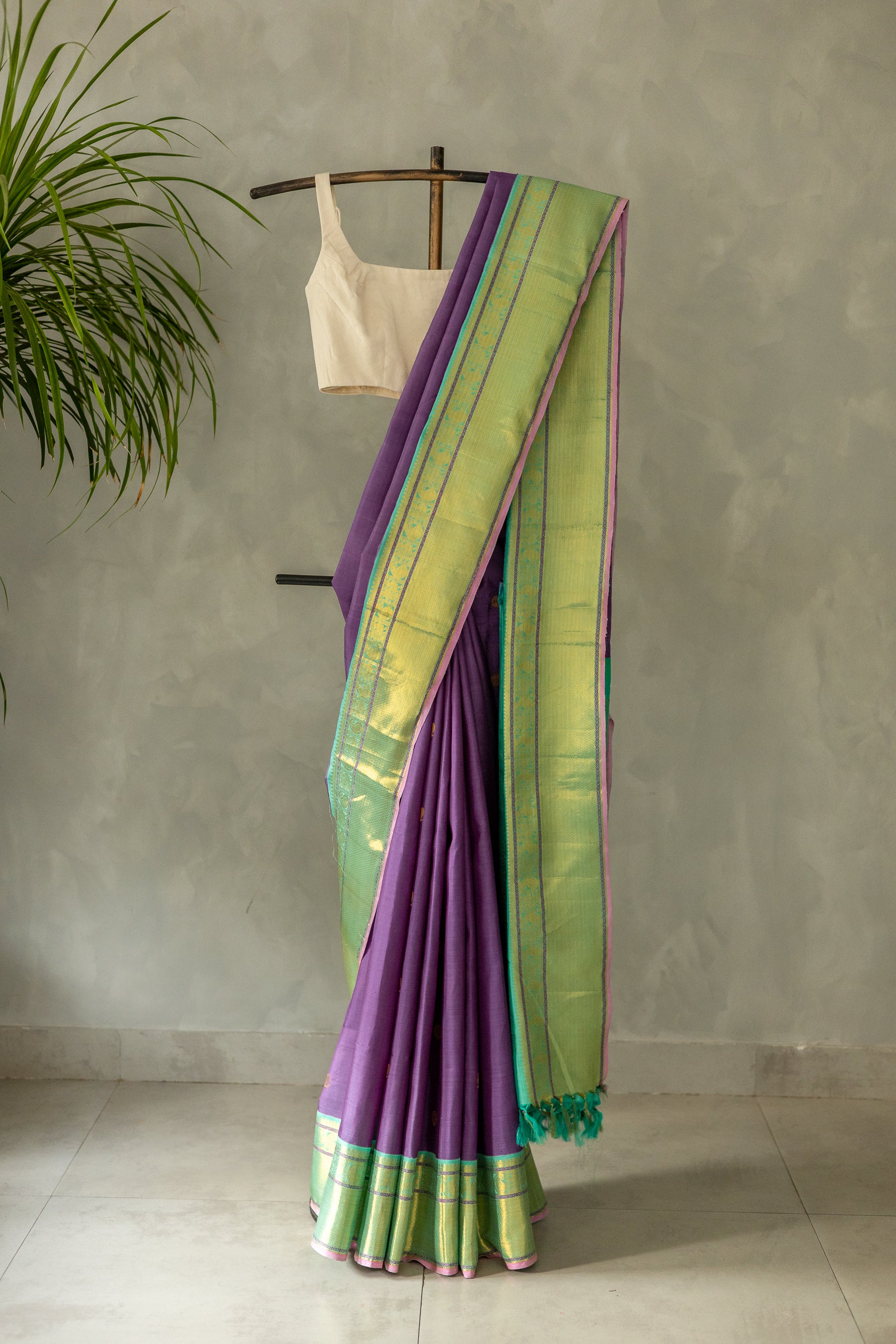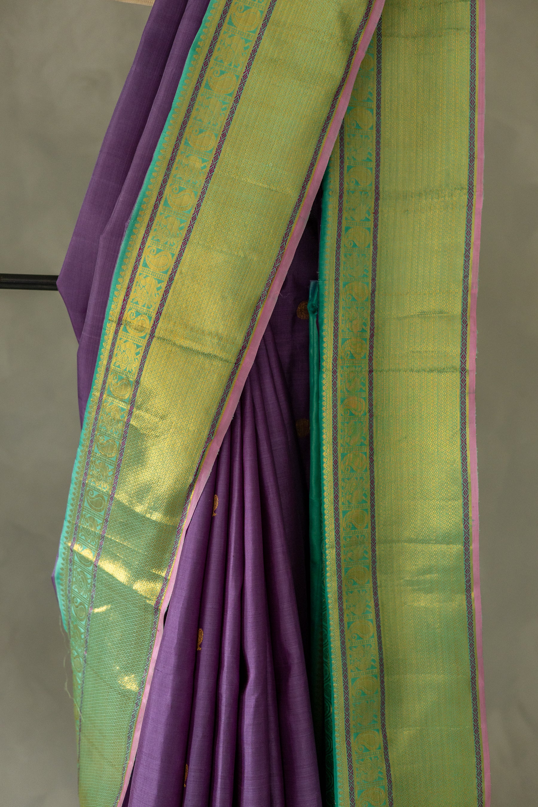 Purple Kanjivaram Silk with Small Round Zari motif and Green Border Saree