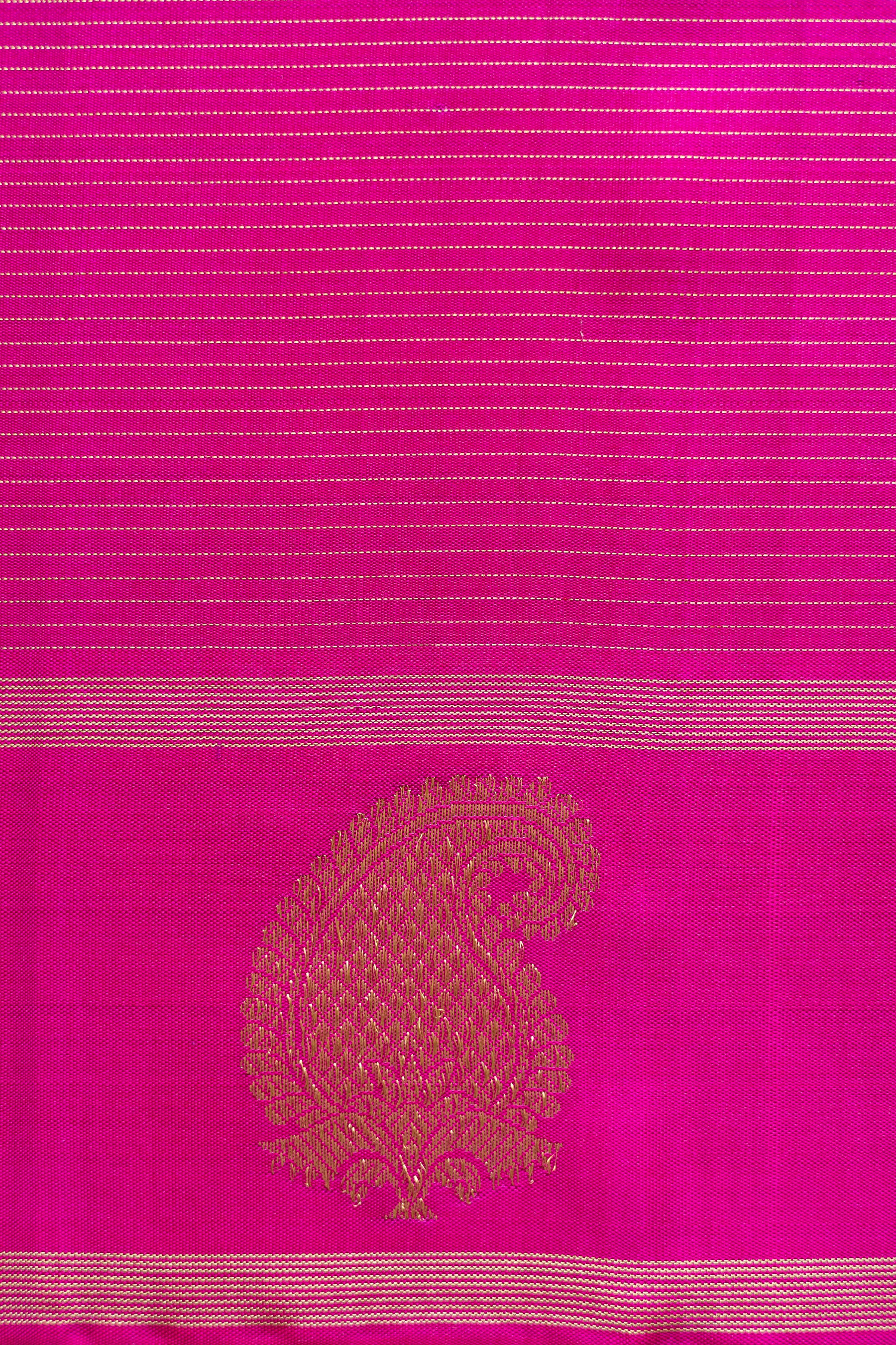 A purple Kanjivaram silk saree woven with all-over small checks (kattam pattern) offers a textured, balanced drape using high-twist mulberry silk yarns. The body’s micro-checks are created through precision jacquard control, lending uniformity and structural density. A contrasting pink border adorned with traditional manga motifs is crafted using korvai interlocking for durability and definition. Rich zari highlights enhance the motifs while maintaining the saree’s classic Kanchipuram character.