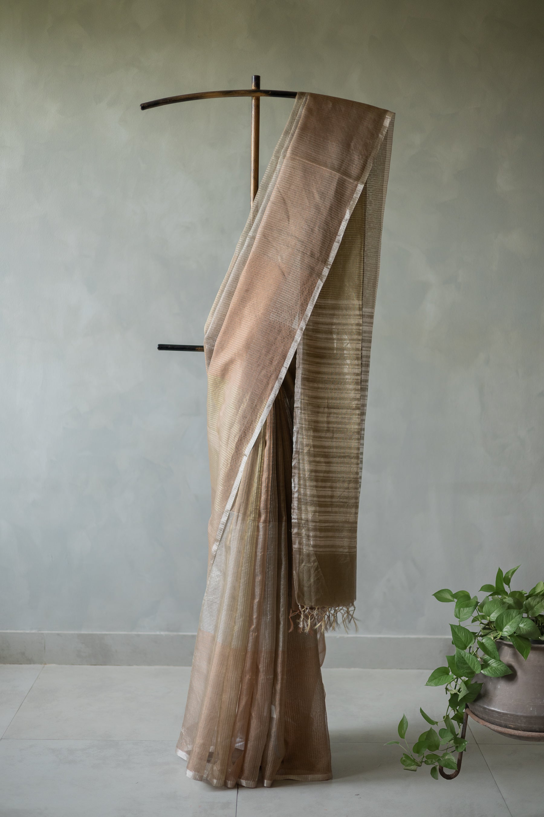 Grey and Brown Silk Cotton All Over Stripes and Checks Saree