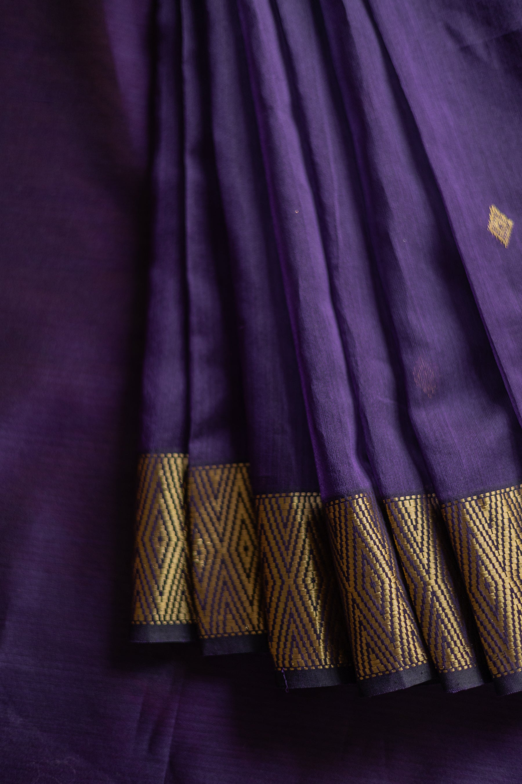 Purple Chanderi Silk Saree featuring a lightweight and sheer silk-cotton blend, known for its crisp texture and gentle sheen. The body is woven in a rich purple tone and adorned with fine diamond-shaped motifs in a subtle zari weave, offering a traditional yet refined aesthetic. The saree includes a matching blouse piece and is finished with a soft selvedge and neatly handwoven pallu, making it ideal for festive and semi-formal occasions.