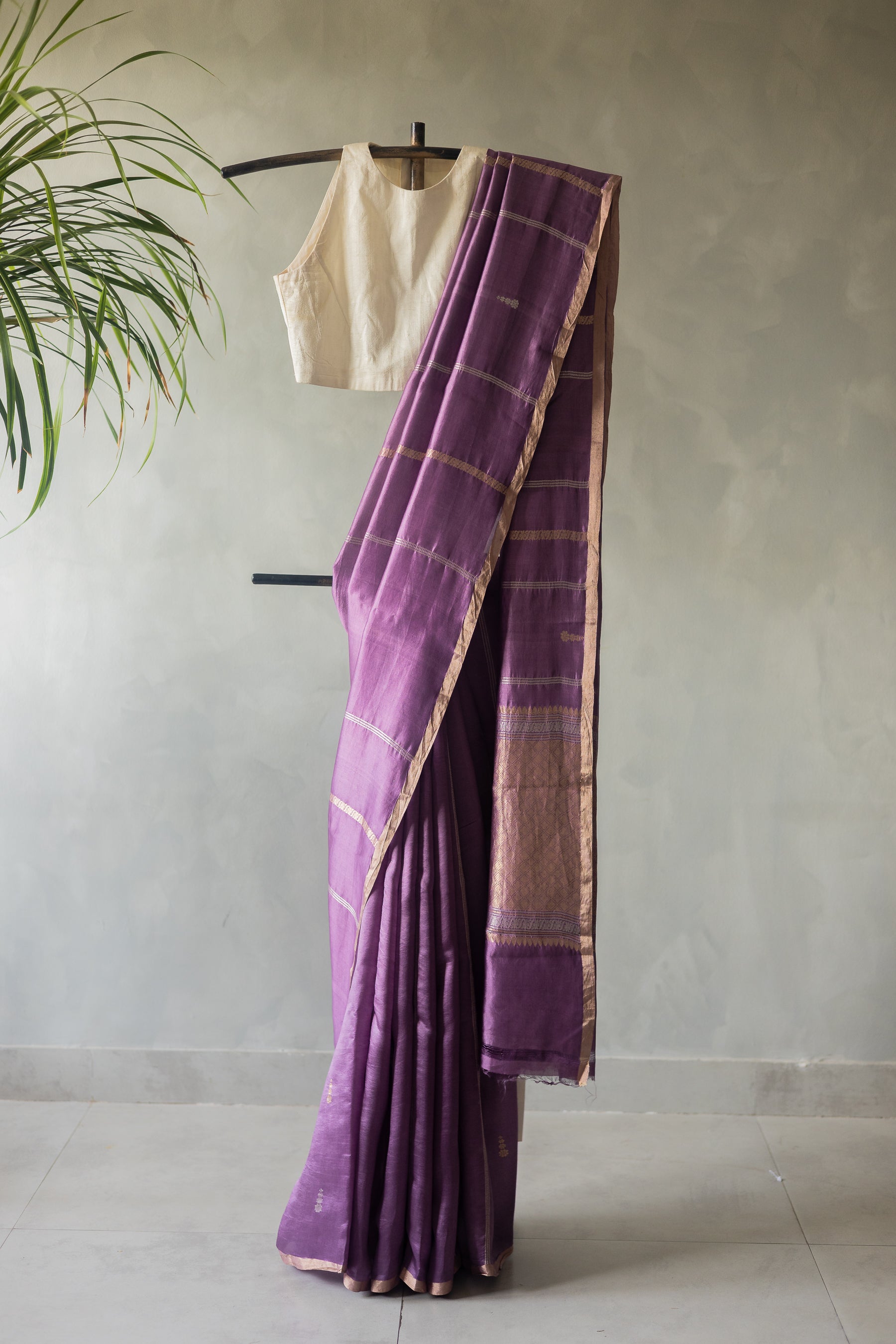 Purple Pure Chanderi Silk with Muted Olive Green Blouse Saree