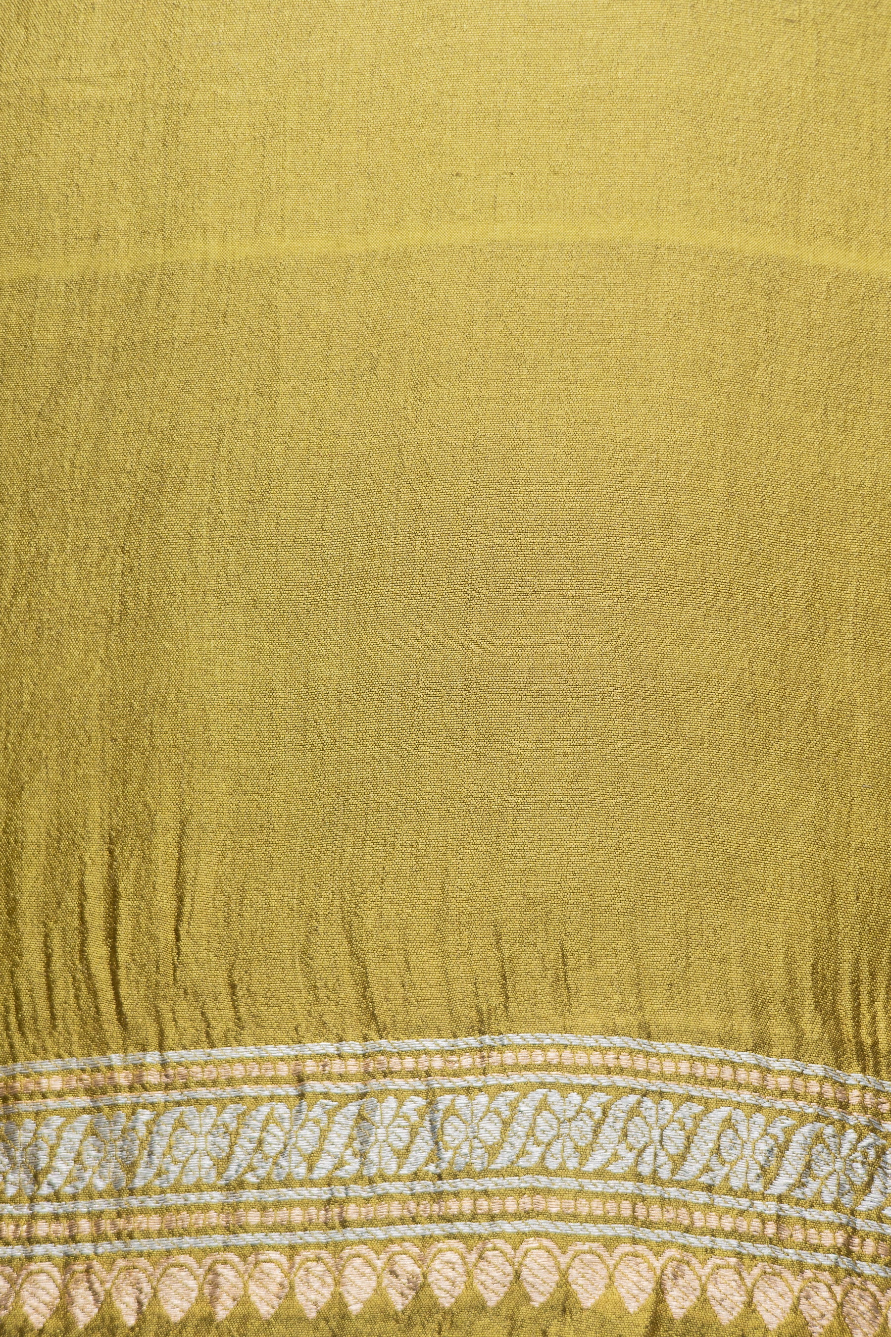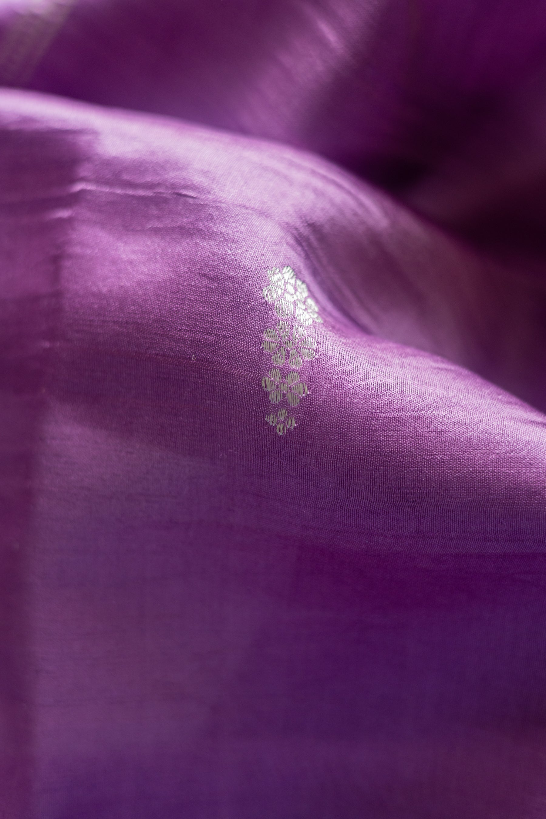 Purple pure Chanderi silk saree crafted from lightweight handwoven silk with a fine plain weave and natural sheen. The fabric features a semi-sheer texture and fluid drape characteristic of authentic Chanderi silk. The saree is paired with a muted olive green silk blouse, offering a balanced contrast with low chroma and earthy undertones. Subtle zari detailing on the pallu accents a refined, understated aesthetic while preserving the saree’s elegance.