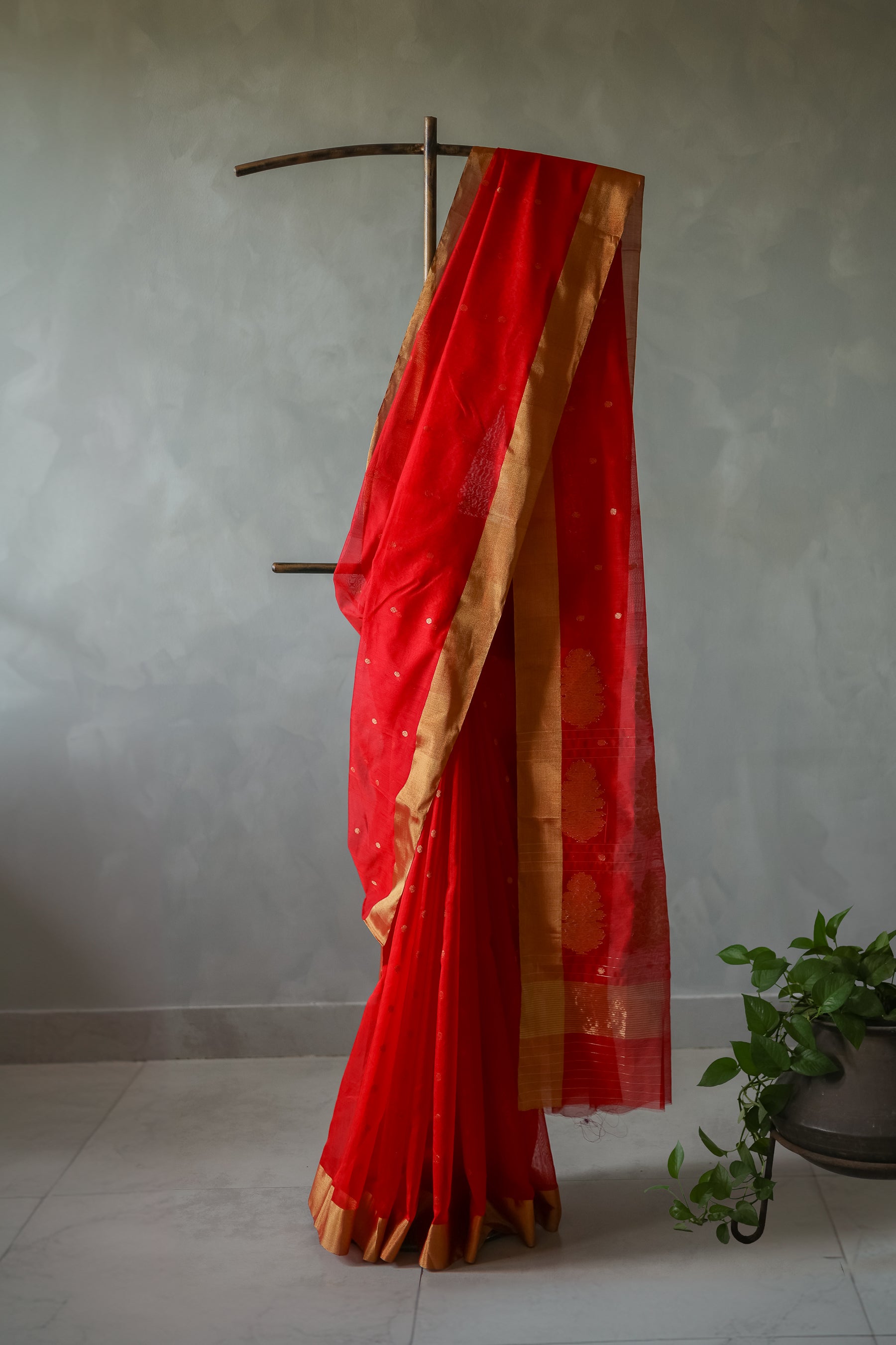 This Red Chanderi Silk Saree combines elegance and tradition with its stunning blend of silk and cotton. The fabric is soft, breathable, and lightweight, offering both comfort and a subtle sheen. It features delicate small round motifs scattered across the body, enhancing its beauty with intricate detailing. The rich red hue adds vibrancy, making it perfect for festive occasions, weddings, or special celebrations. The saree’s refined texture and timeless appeal make it a versatile piece that can be paired with a matching or contrasting blouse, ensuring you stand out in any event.