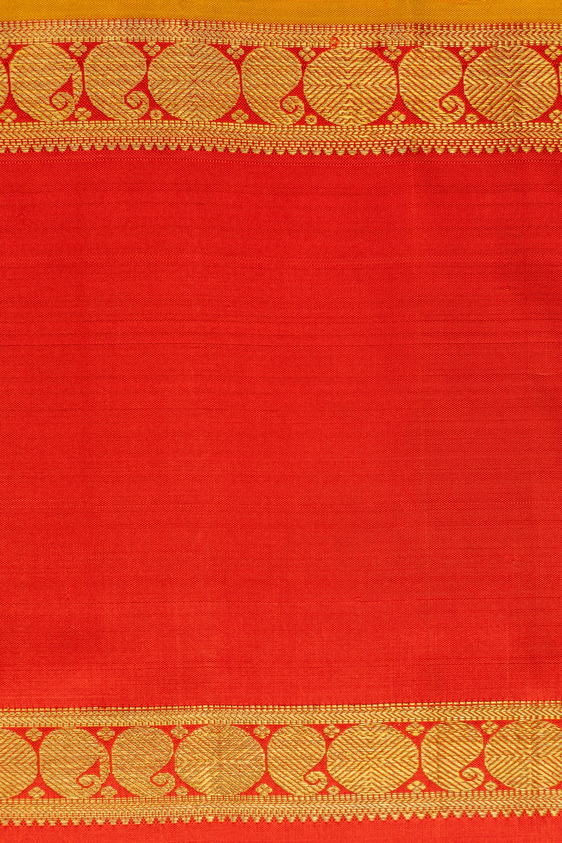 This saree is crafted from pure Kanjivaram silk with a rich royal blue body featuring a smooth, lustrous weave. The bright orange korvai border and pallu are joined using the traditional interlocking technique for a sharp contrast. Zari motifs on the border add definition and elegance. The pallu carries detailed zari patterns showcasing classic Kanchipuram craftsmanship. The dense silk weave ensures a luxurious drape and durability.