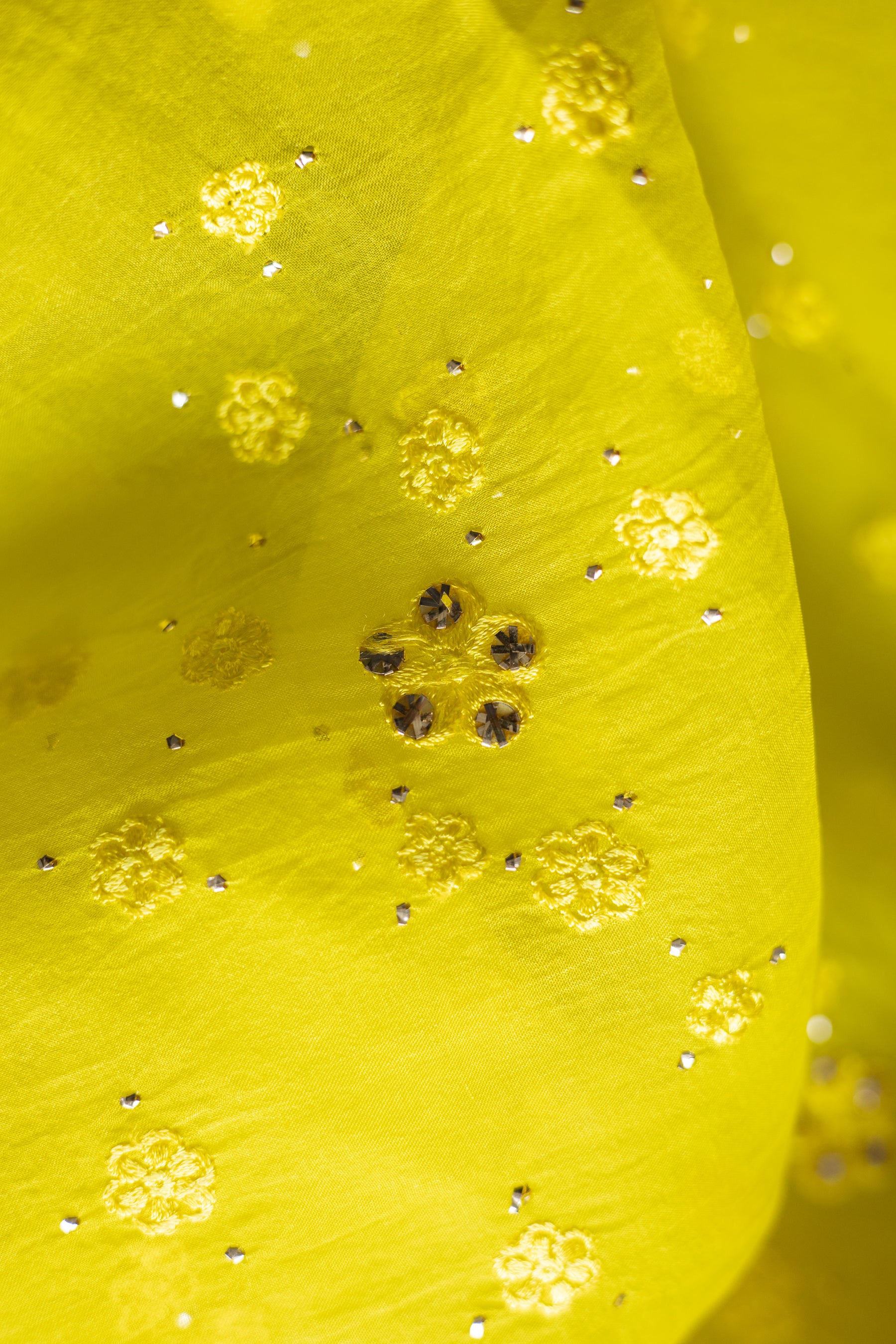 This saree featuring fine, lightweight sheer fabric woven with tightly twisted silk yarns for crisp structure and natural translucence. The body is adorned with detailed embroidery work, executed using silk threads for enhanced definition and minimal weight addition, ensuring the drape remains airy. The saree maintains a smooth, matte–lustrous finish characteristic of organza, with reinforced selvedge and neatly finished edges for durability. The blouse piece is provided in matching fabric to complement the embroidered detailing.